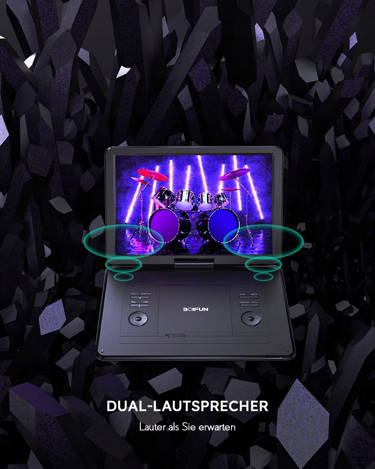 Більше, ніж один динамік, портативний DVD-програвач BOIFUN має конструкцію з подвійними динаміками, які створюють гучніший і чистіший звук. Гарні поради: звук залежить не лише від пристрою відтворення, а й від джерела звуку DVD.