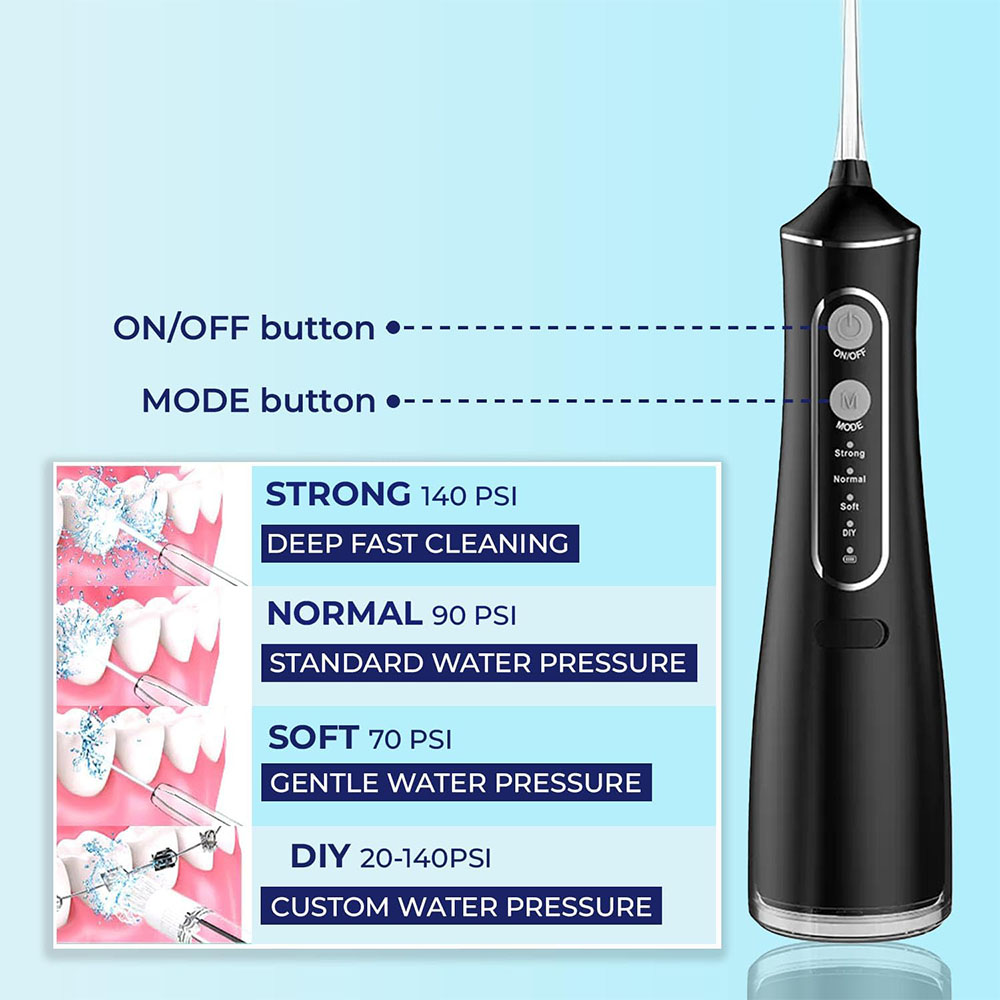 Зубний іригатор, що перезаряджається, має 4 режими (потужний, стандартний, ніжний, домашній), щоб задовольнити ваші потреби в чищенні порожнини рота, незалежно від того, чи це чутливі зуби, брекети чи щоденне чищення.