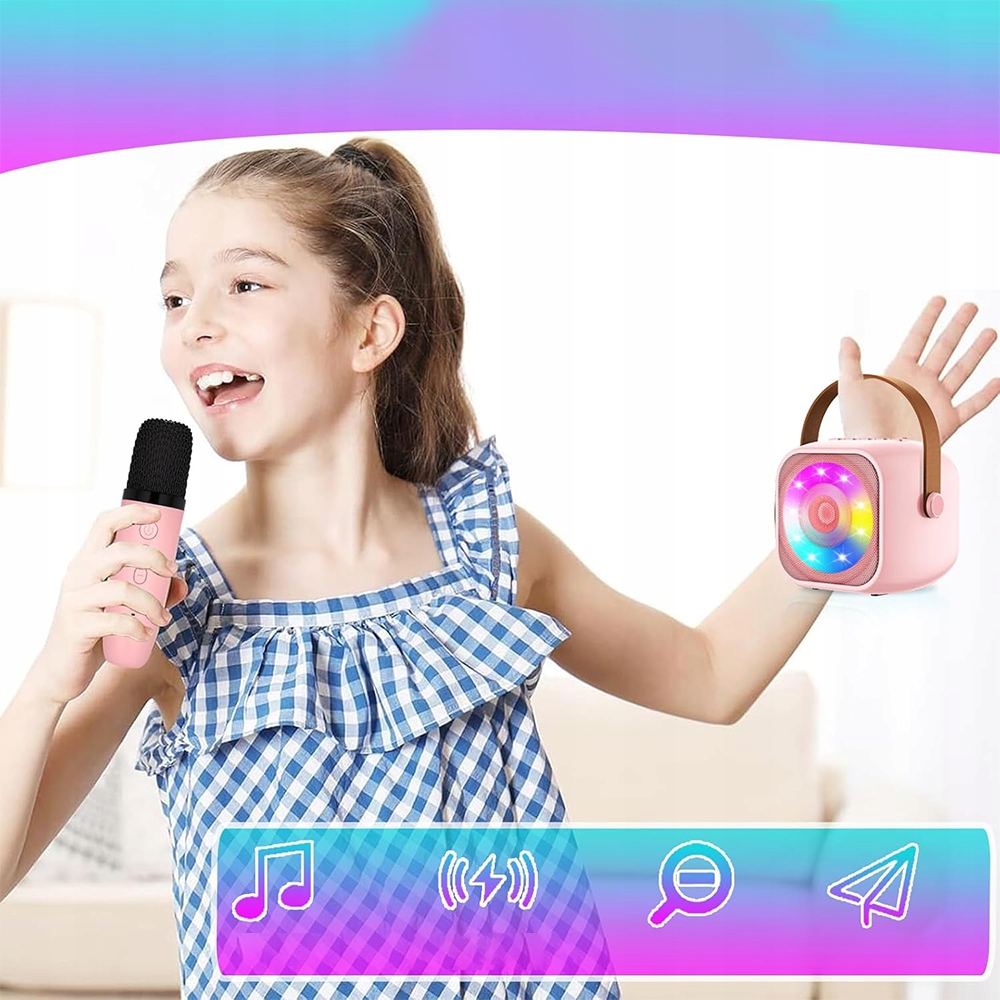 Ця співоча машина для дітей для дітей дуже практична. Він може не тільки співати з мікрофоном, але також може бути використаний як динамік для самостійної музики. Наші мікрофони приносять енергію на вечірку! Чудово підходить для вечірок на день народження, сімейних конгресів, інших веселих заходів, подарунків для дівчат, іграшок для дітей. "Співайте, танцюйте і блищать завдяки нашому портативному та веселому мікрофону!"
