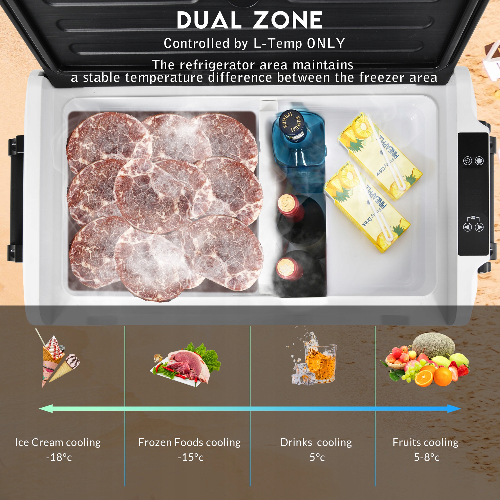 Цей автомобільний холодильник розроблений для двох роз’ємів живлення з постійним струмом. адаптер 12В/24В і адаптер змінного струму 100-240В, які можна використовувати вдома або в автомобілі. Користувачі можуть заморожувати м’ясо, овочі, напої та інші продукти, які потребують різних температур зберігання, що робить його найкращим вибором для кемпінгу, вечірок, подорожей і активного відпочинку.