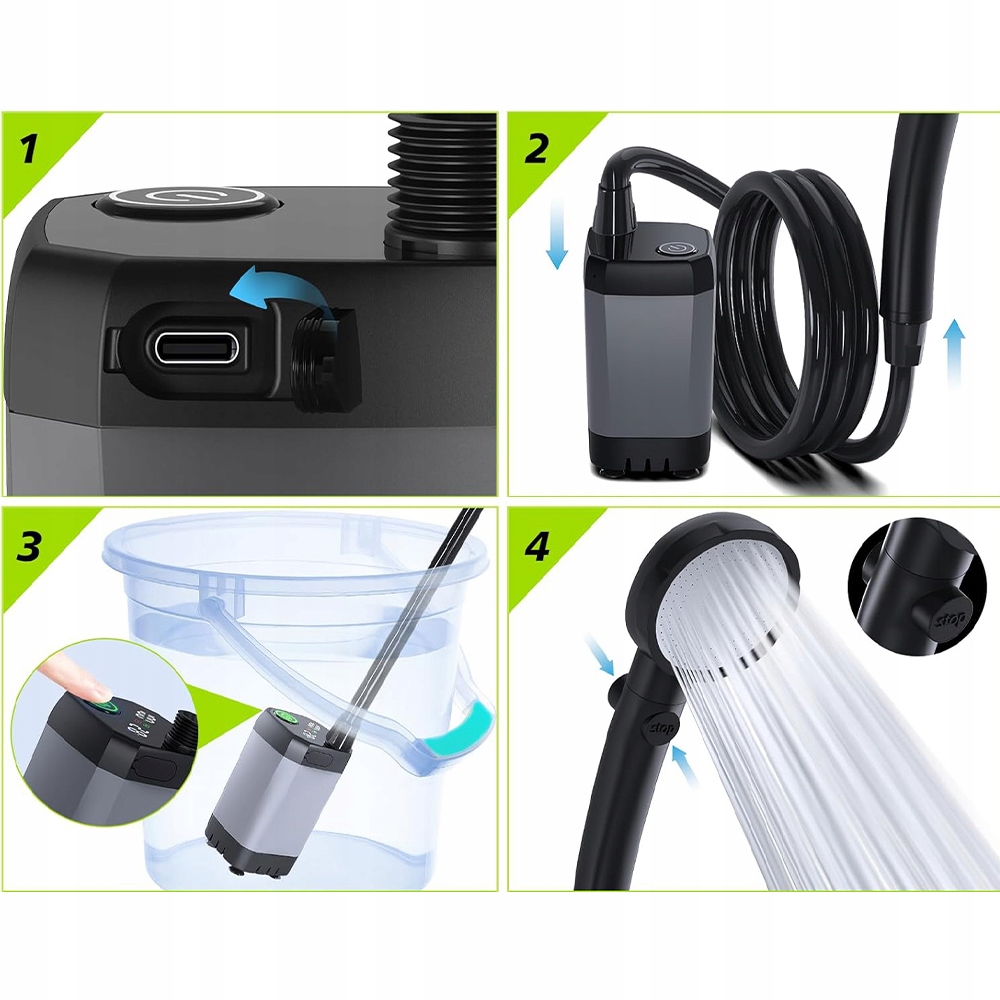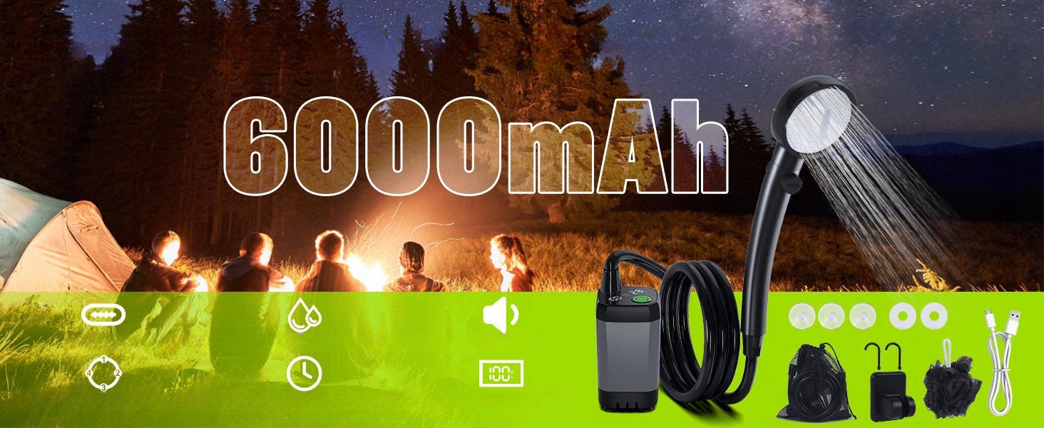 Портативний кемпінг -душ має вбудований акумулятор 6000 мАг, який після повного заряду може працювати безперервно протягом 120–150 хвилин. Портативний кемпінг-душ оснащений портом типу C, який можна зарядити за допомогою зарядного пристрою для мобільного телефону (5 V-2 A), мобільного телефону, ноутбука або USB-виводу в машині, що дуже комфортно.