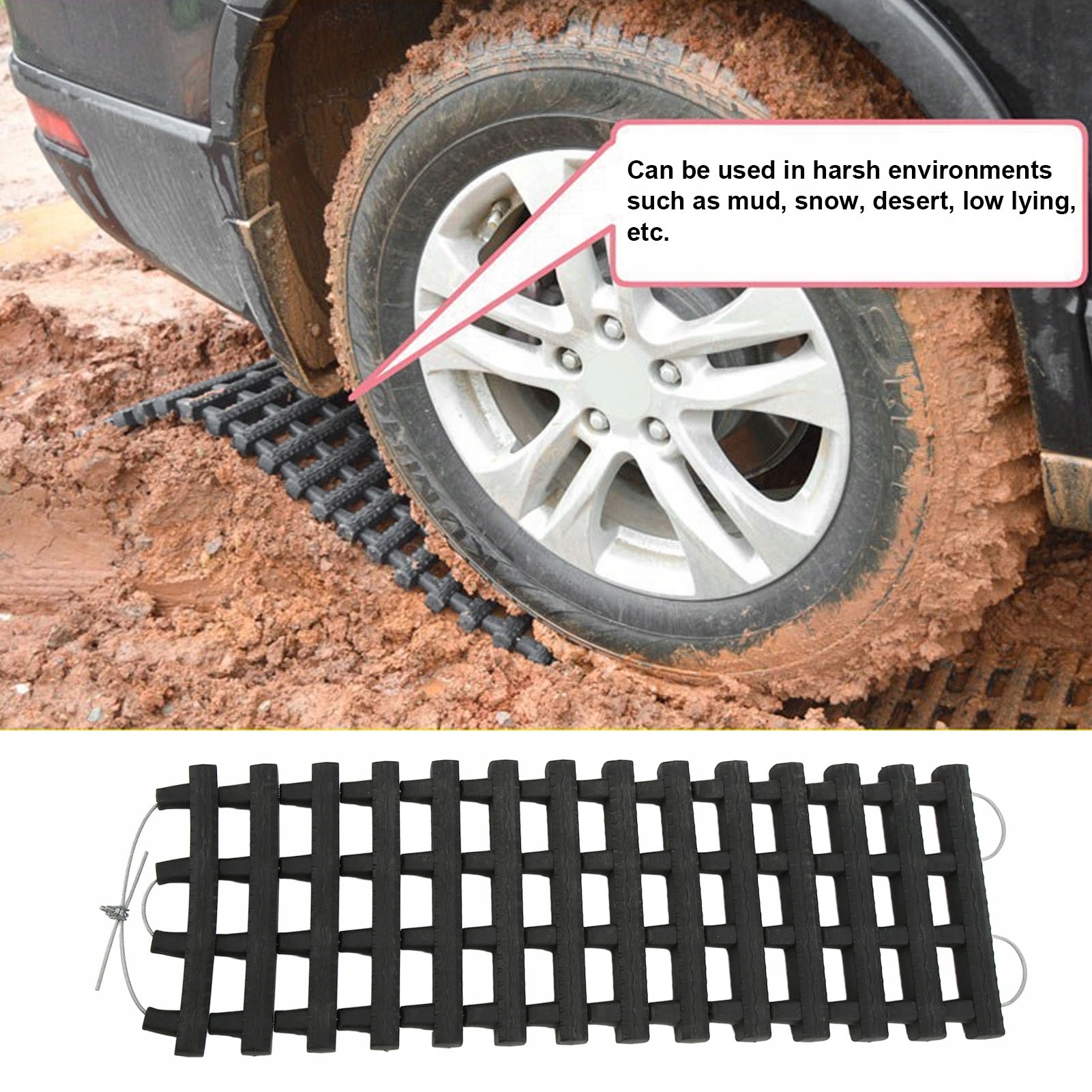 1. Характеристика: килимок для зчеплення шини можна використовувати в суворих умовах, таких як бруд, сніг, пустеля, низина тощо, шириною 22 см/8,7 дюйма та товщиною 2,5 см/1 дюйм.