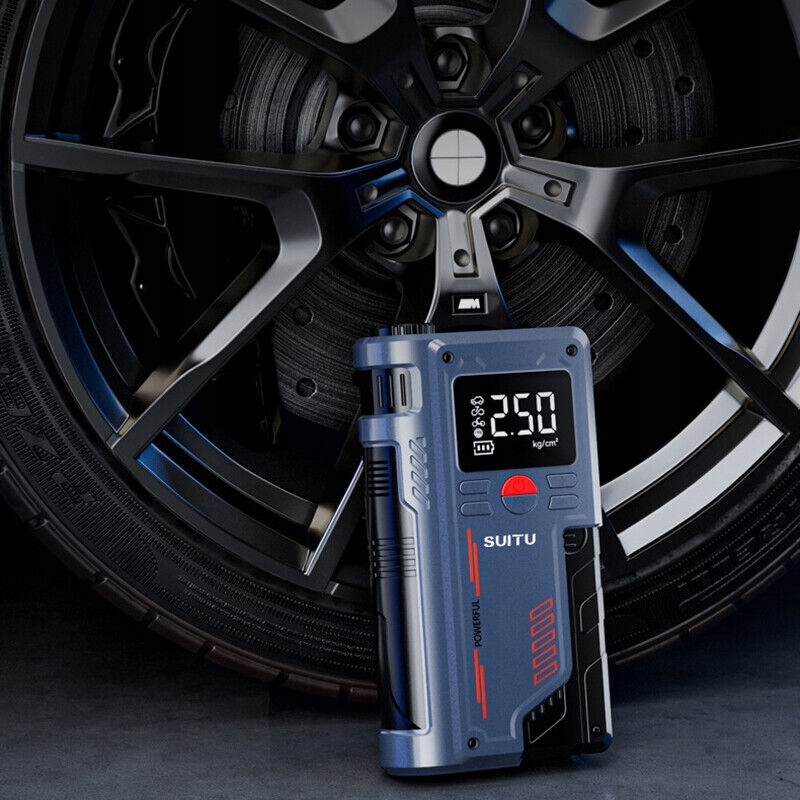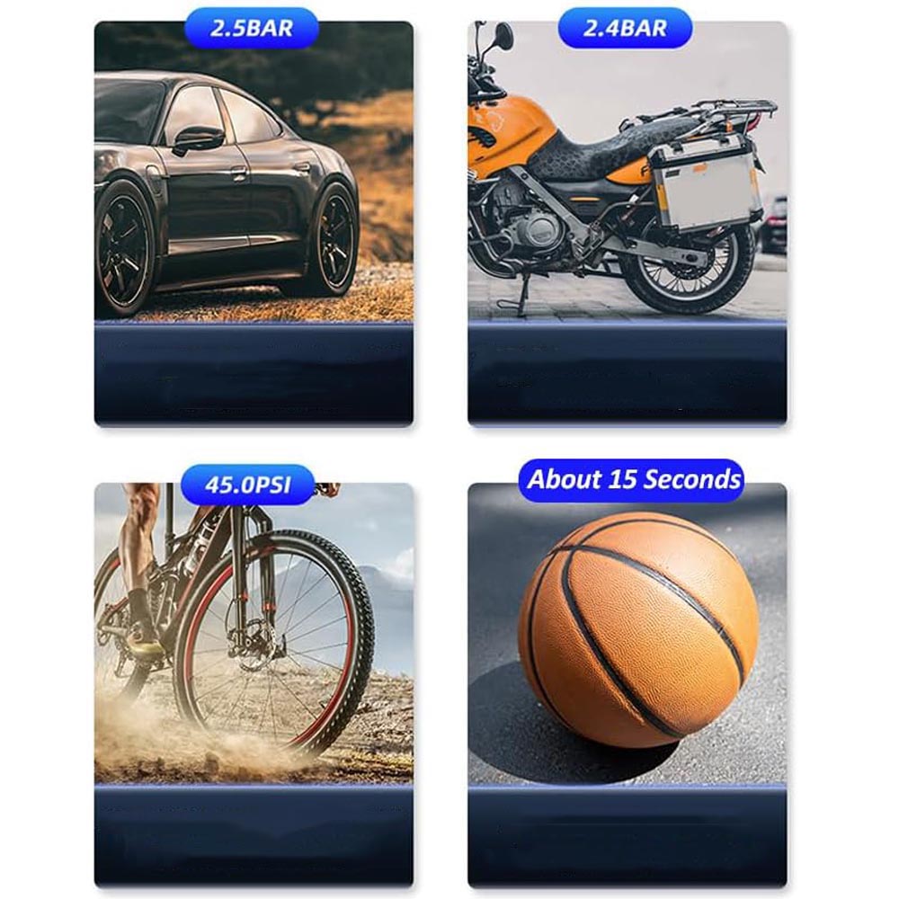🏀【Портативний повітряний компресор 150 PSI】 Вбудований повітряний компресор високої потужності 150 PSI, підтримує визначення тиску в шинах, утримує задані значення та одиниці перемикання (PSI, бар, Kpa, кг/см²). За допомогою 4 різних насадок ви можете накачати автомобілі, позашляховики, велосипеди, м'ячі та інші надувні об'єкти. Продукт можна використовувати в більшості транспортних засобів із надувними колесами.