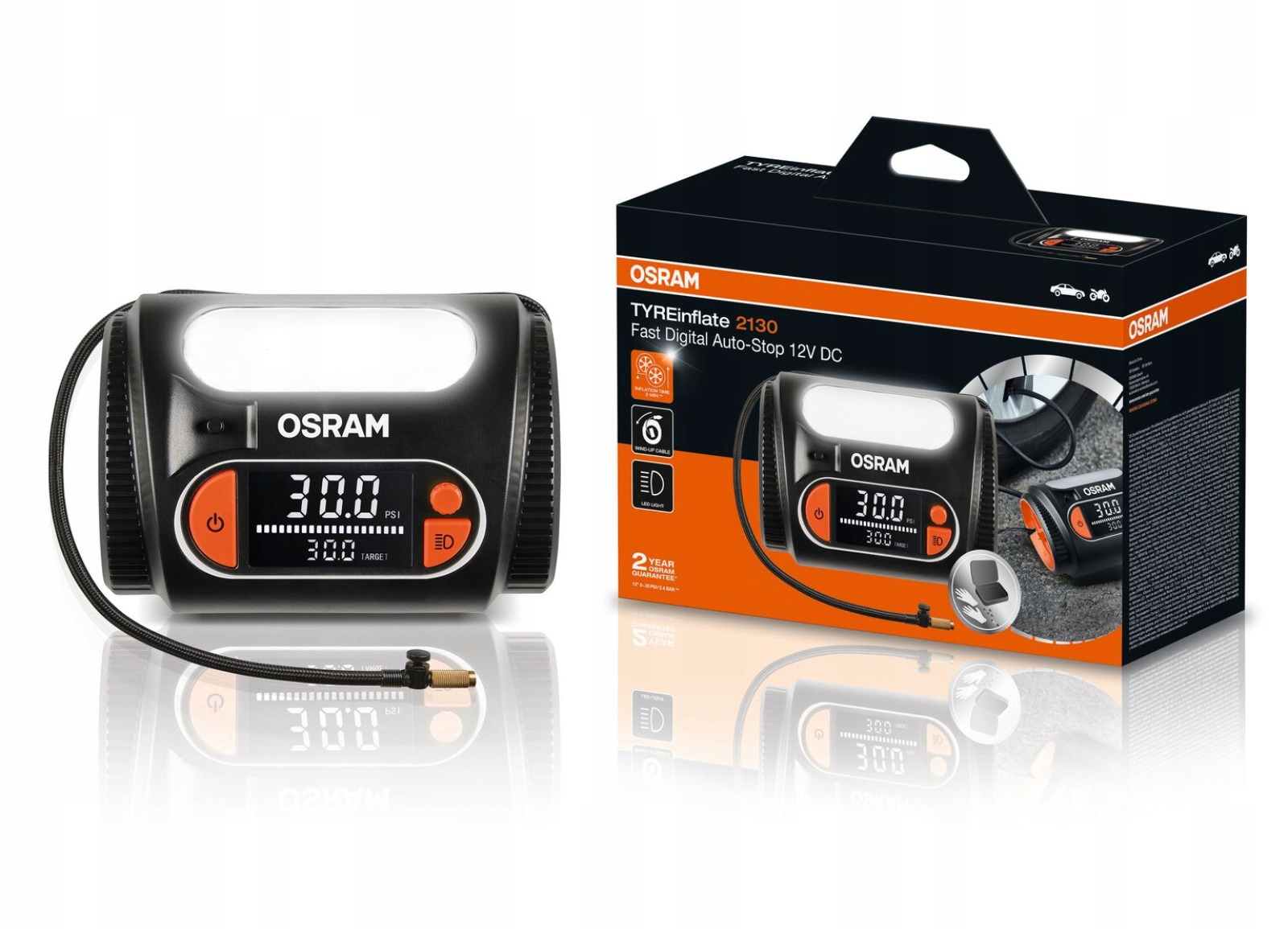 Познайомтеся з флагманською моделлю з серії нового покоління: Osram tyreinflate 2130. Розроблений для тих, хто потребує найвищої ефективності Osram, цей компресор оснащений дуже великим цифровим манометром з показником прогресу для прозорості та контролю. Інтуїтивний обертовий контролер дозволяє бажаний тиск за кілька секунд, тоді як функція автоматичного повторення тиску гарантує точне встановлення тиску з кожною інфляцією.