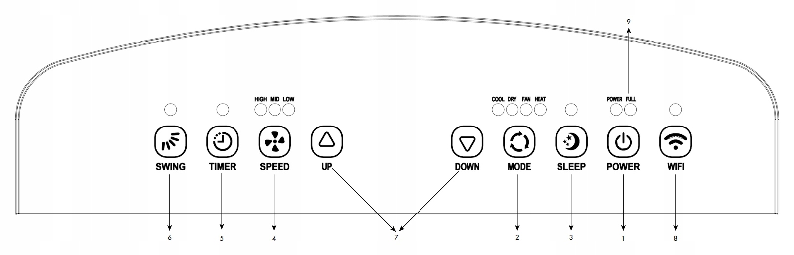 6. ФУНКЦІЯ КОЛИВАННЯ (КОЛИВАННЯ) - Кнопка гойдання вмикає/вимикає коливання виходу холодного повітря.