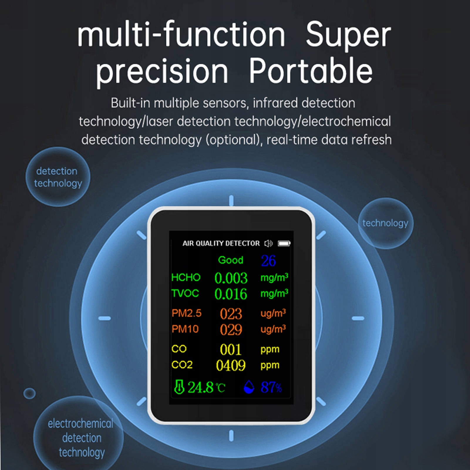 датчик: напівпровідниковий датчик TVOC, електрохімічний датчик CO, інфрачервоний датчик PM2.5, датчик температури та вологості