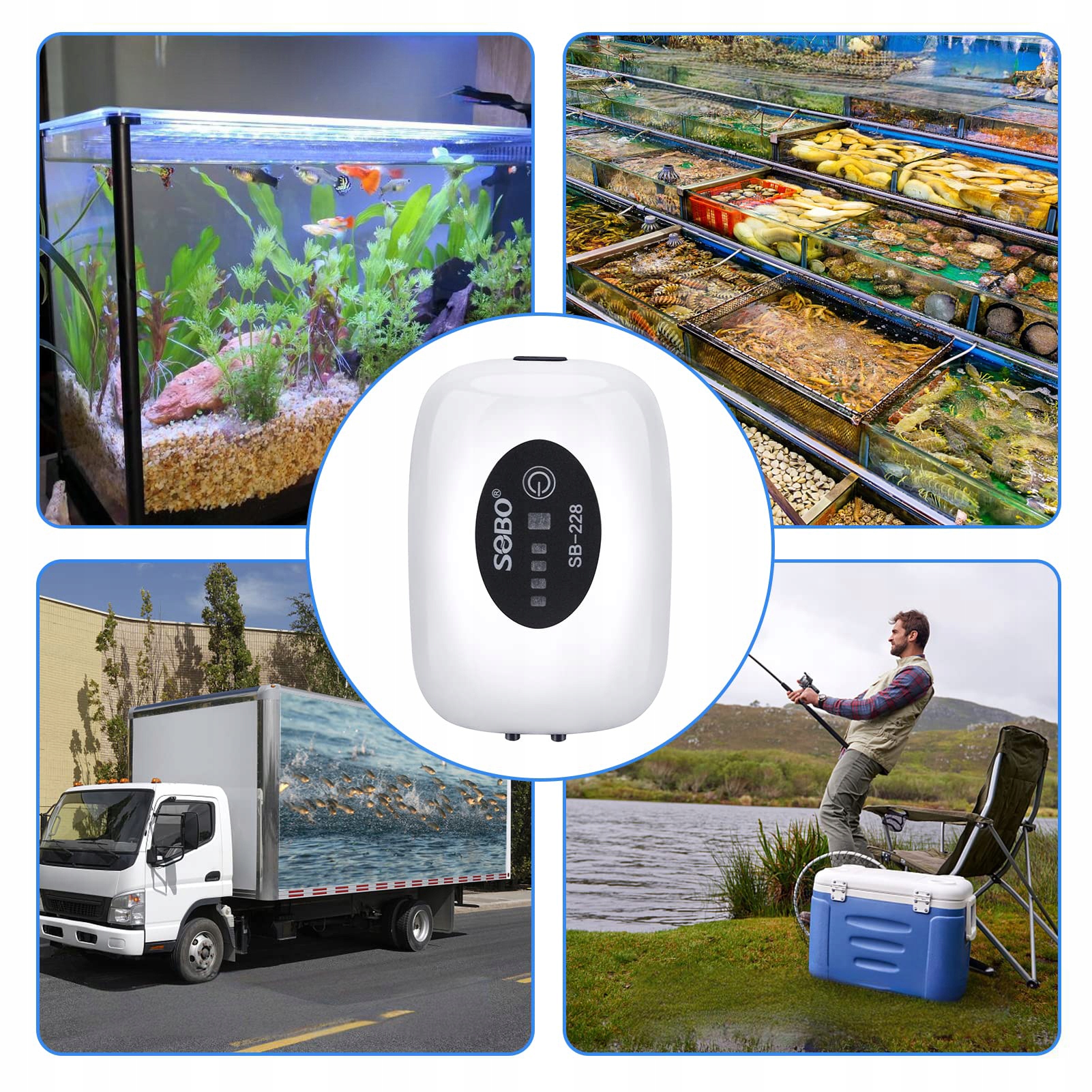 Портативний акваріумний насос підходить для домашнього акваріума, риболовлю на відкритому повітрі, акваріумі, транспорті ставок, надзвичайних ситуацій та інших місць, де необхідно збільшити кількість кисню. При 75% потужності становить близько 35 дБ, так що акваріум був більш ефективним киснем, не порушуючи щоденної роботи.