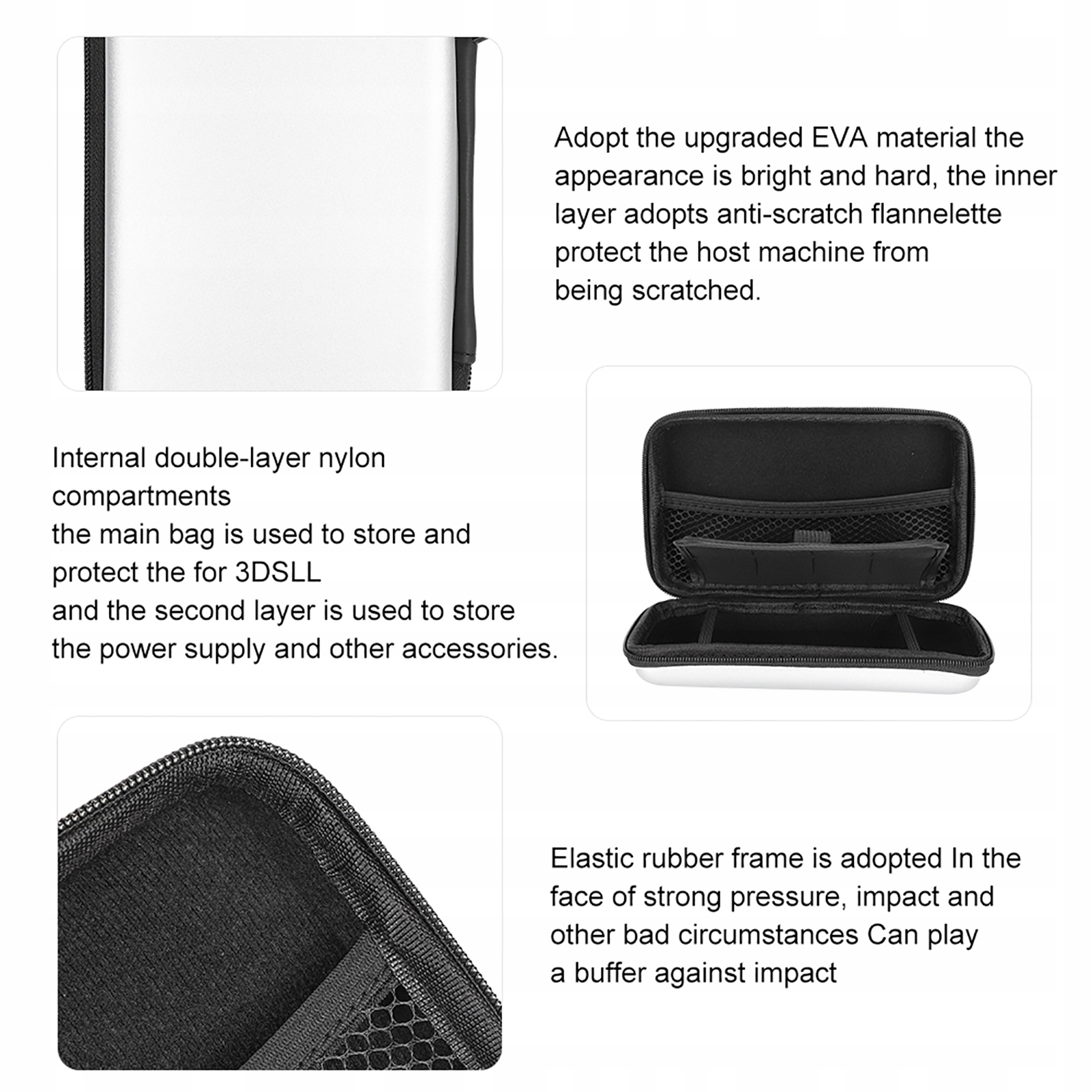 3. Внутрішні двошарові нейлонові відділення, основна сумка призначена для зберігання та захисту 3DSLL, а другий шар призначений для зберігання блоку живлення та інших аксесуарів.