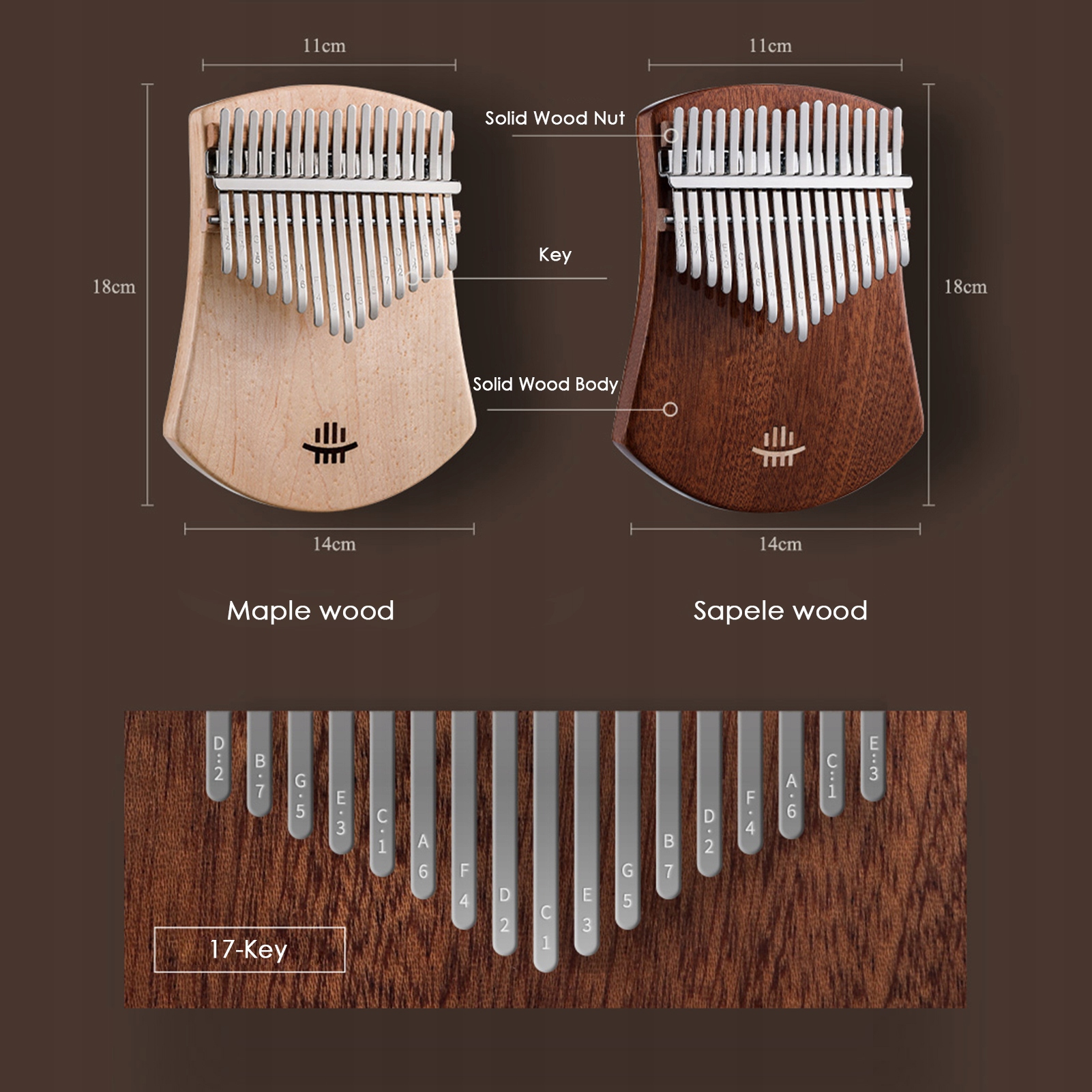 - 17-клавішний, простий у вивченні: мінеральні металеві клавіші створюють чудовий, повний і кришталево чистий звук, на кожному штирі вигравірувано відповідне ім’я ноти, що легко розібрати.