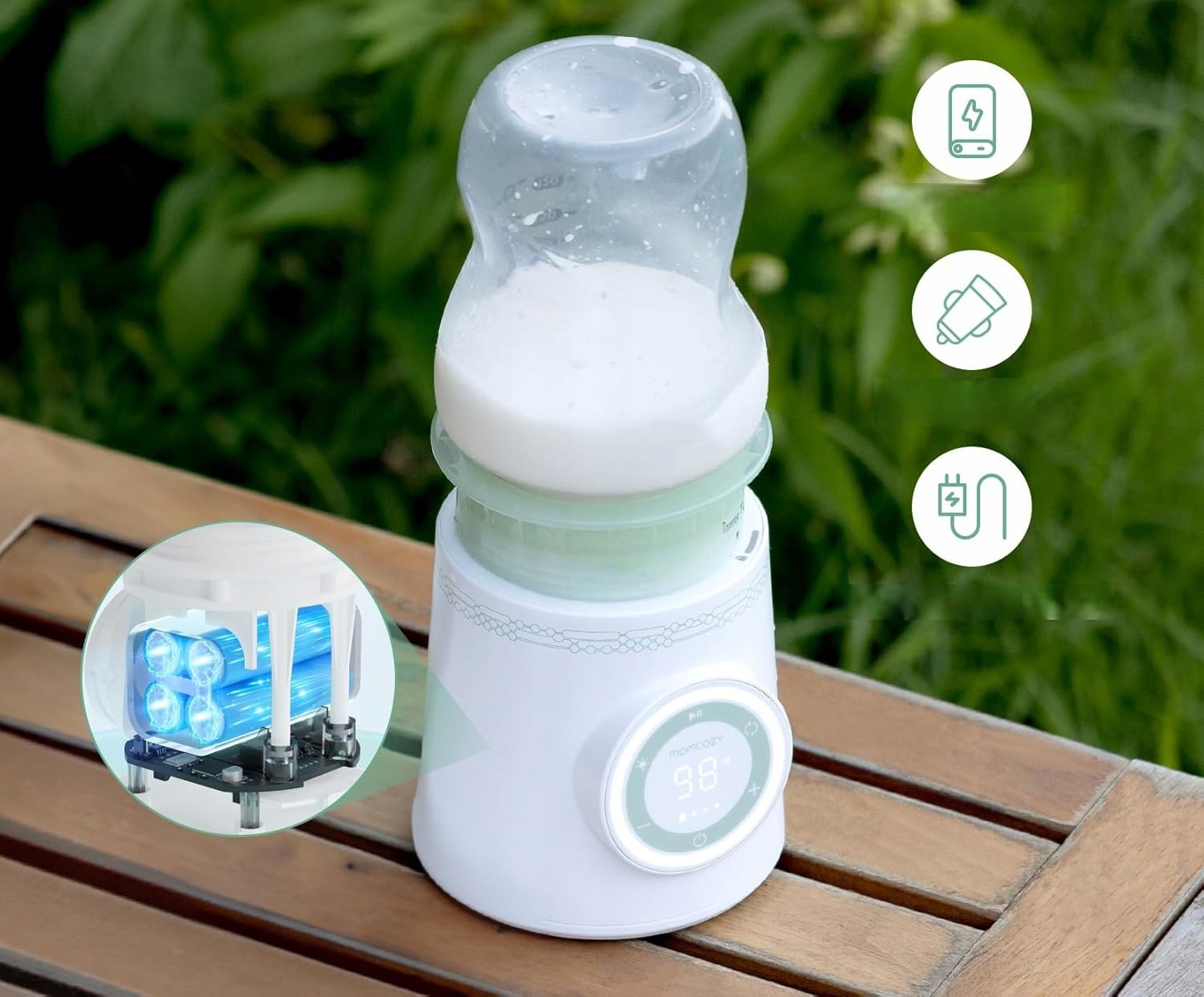 Момбозійний нагрівач пляшок - це чудове рішення для батьків, які цінують комфорт та мобільність. Завдяки компактному, бездротовому дизайну, він ідеально працює як вдома, так і під час подорожей, прогулянок або поїздок на відкритому повітрі. Пристрій дозволяє швидко і навіть нагрівати грудне молоко або модифіковане молоко до ідеальної температури, зберігаючи при цьому всі харчові значення. Точне регулювання температури та жорстка конструкція роблять його надійним супутником повсякденного догляду за малюком.