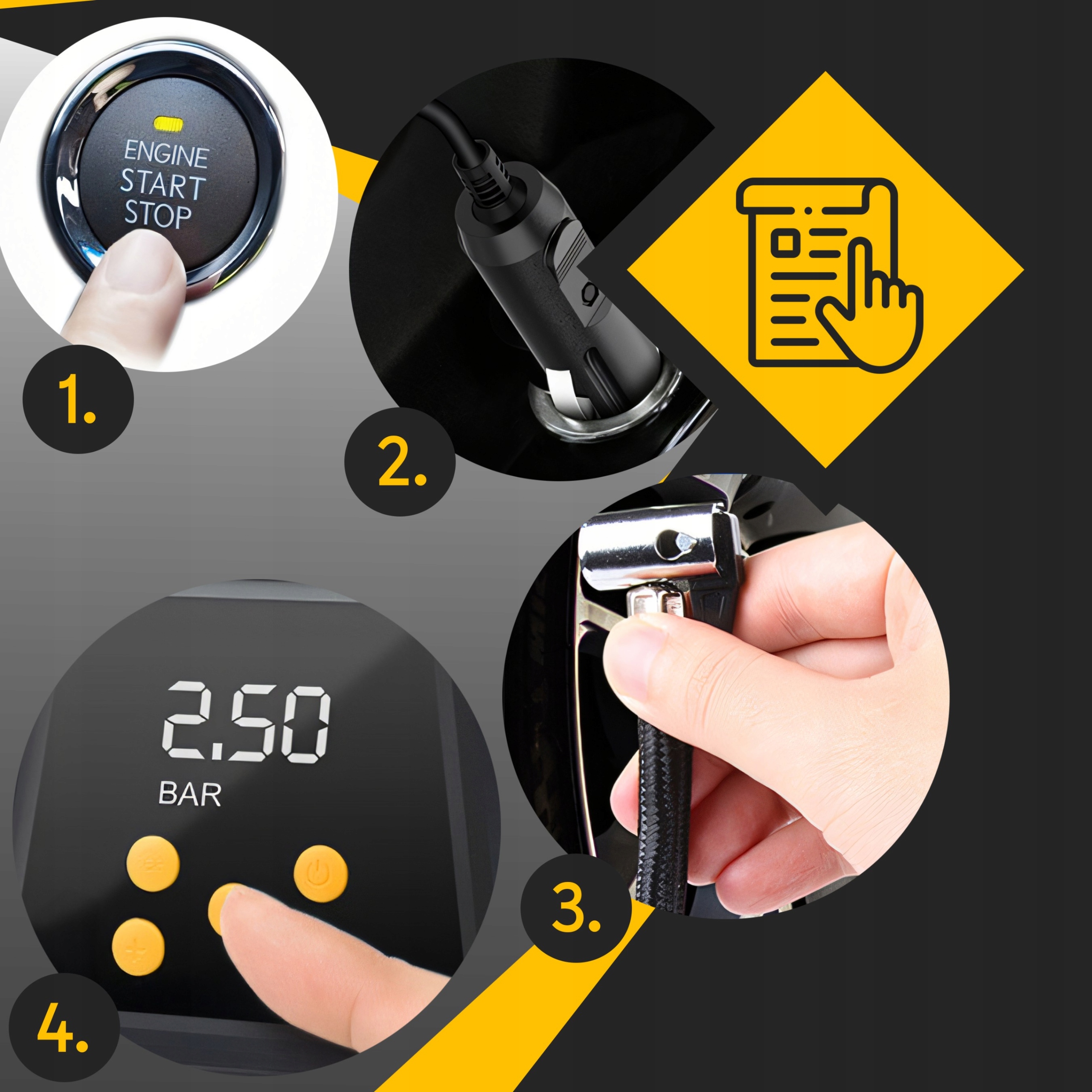 ⭐ шнур живлення - Компресор має 3 -метровий кабель, що забезпечує велику свободу руху та можливість досягнення кожного колеса.