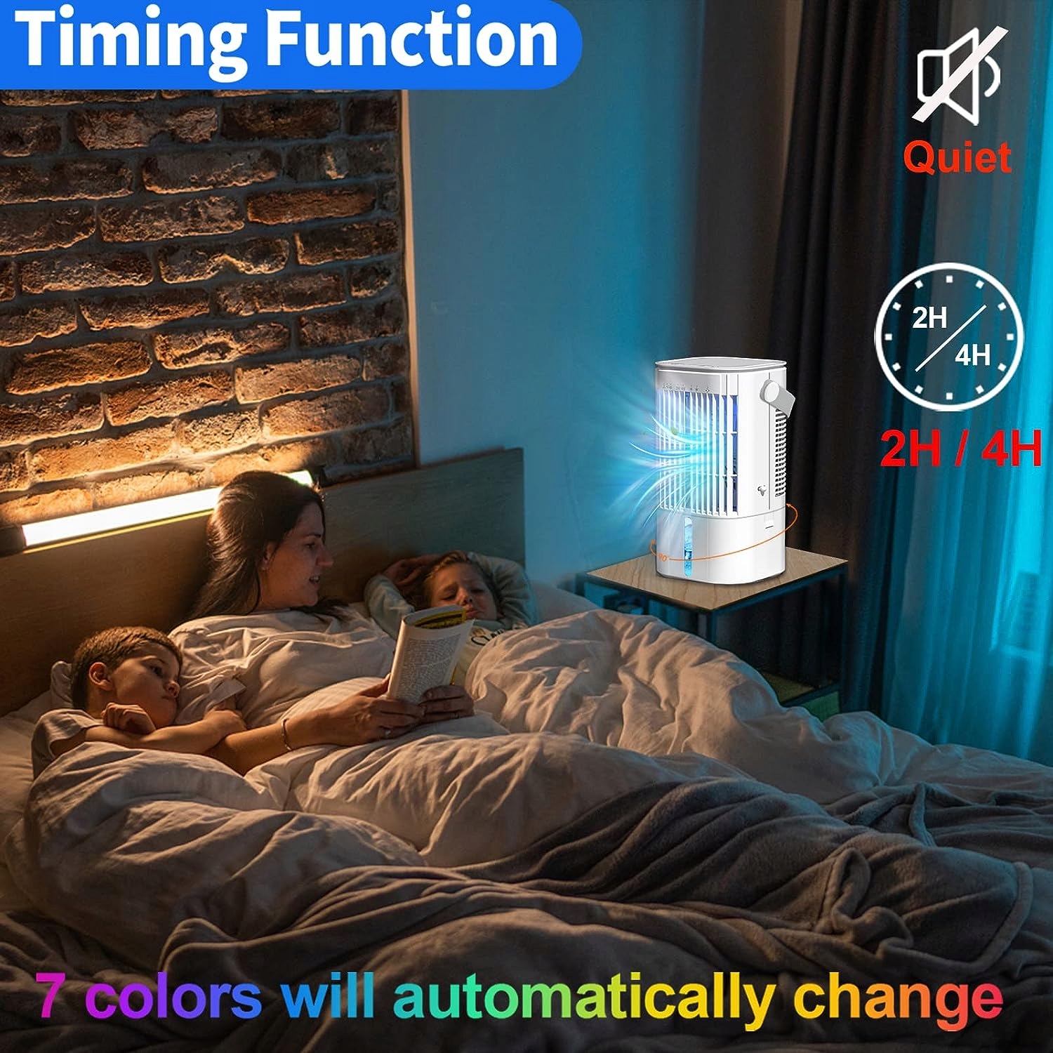 Оновлений міні-охолоджувач повітря використовує унікальну технологію, він може ефективно працювати з низьким рівнем шуму 40 дБ (макс. 55 дБ). Вбудоване світлодіодне підсвічування не тільки створить романтичну атмосферу, але й допоможе вам краще спати. Ви можете вибрати колір і швидкість вітру відповідно до свого настрою або використовувати його як нічник або повністю вимкнути. (Торкніться кнопки підсвічування протягом 3 секунд, щоб увімкнути або вимкнути).