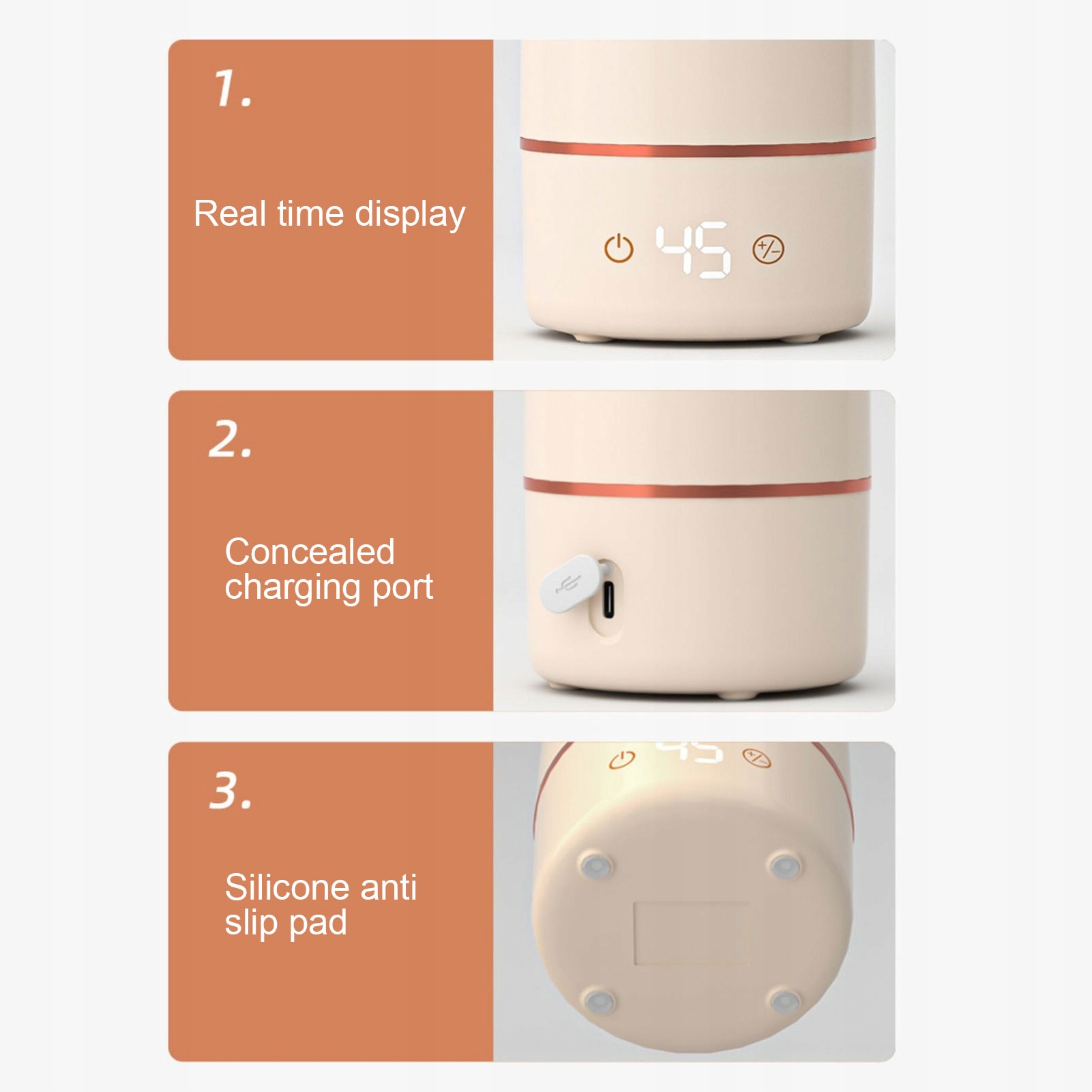 1. Портативна конструкція: Портативна нагріта кухоль була розроблена так, щоб її можна було легко переміщувати завдяки своїй бездротовій функції, що робить її ідеальною для годування маленької дитини, коли ви знаходитесь на вулиці. Незалежно від того, ви маєте справу з речами чи подорожуєте, ця чашка зручна і практична.