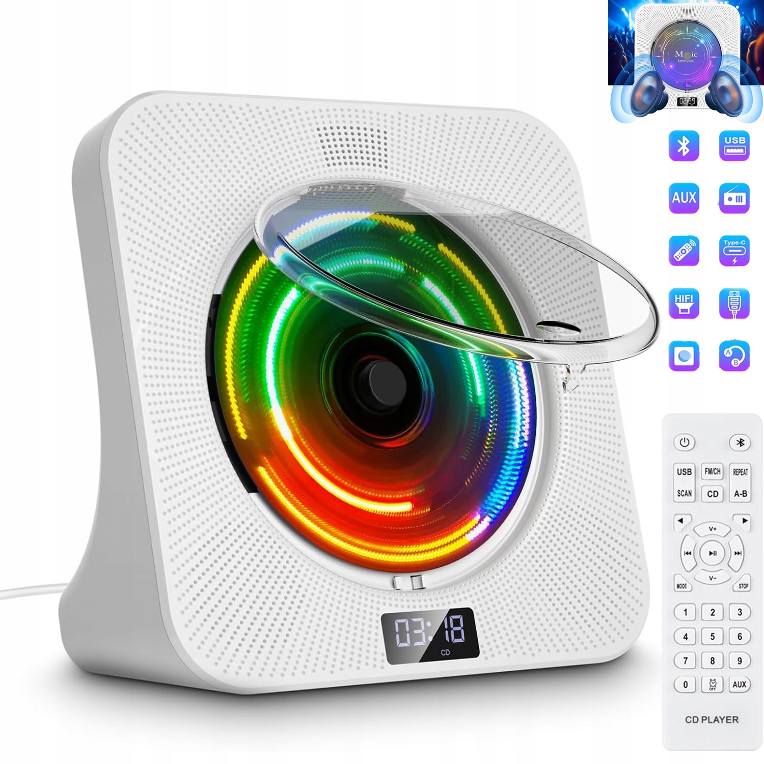 ✅ ✅ ✅ CD робочий стіл CD оснащений переднім дисплеєм, щоб полегшити його використання. Цей багатофункціональний музичний програвач має 5 режимів: режим CD, режим Bluetooth, FM -режим, режим USB та режим AUX. Різні режими оснащені різним освітленням, щоб створити романтичну музичну атмосферу у вашому домі. У комплекті з пиловою кришкою, пультом дистанційного керування та адаптером, гравець повинен керувати силовим кабелем.