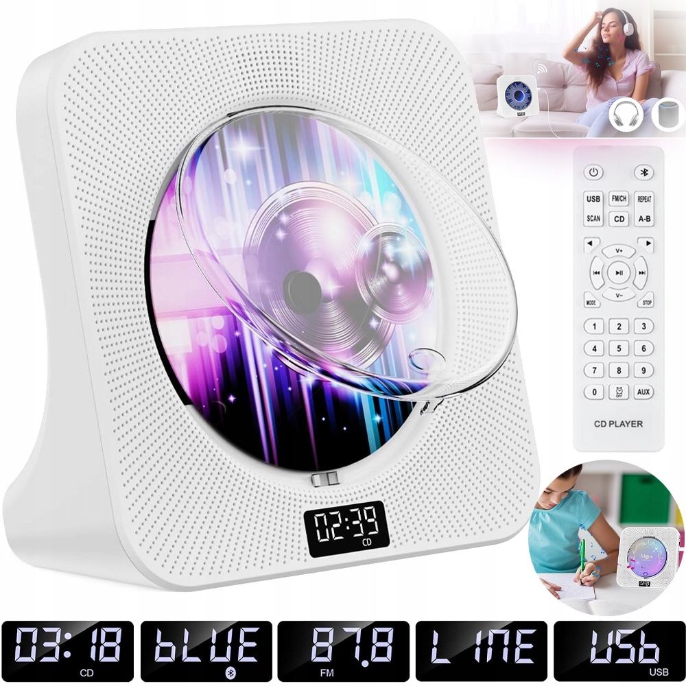 ✅✅Настільний програвач компакт-дисків обладнано переднім дисплеєм для зручного використання. Цей багатофункціональний музичний плеєр має 5 режимів: режим CD, режим Bluetooth, режим FM, режим USB і режим AUX. Різні режими оснащені різним освітленням для створення романтичної музичної атмосфери у вашому домі. Поставляється з пилозахисною кришкою, пультом дистанційного керування та адаптером, програвачем потрібно керувати через кабель живлення.