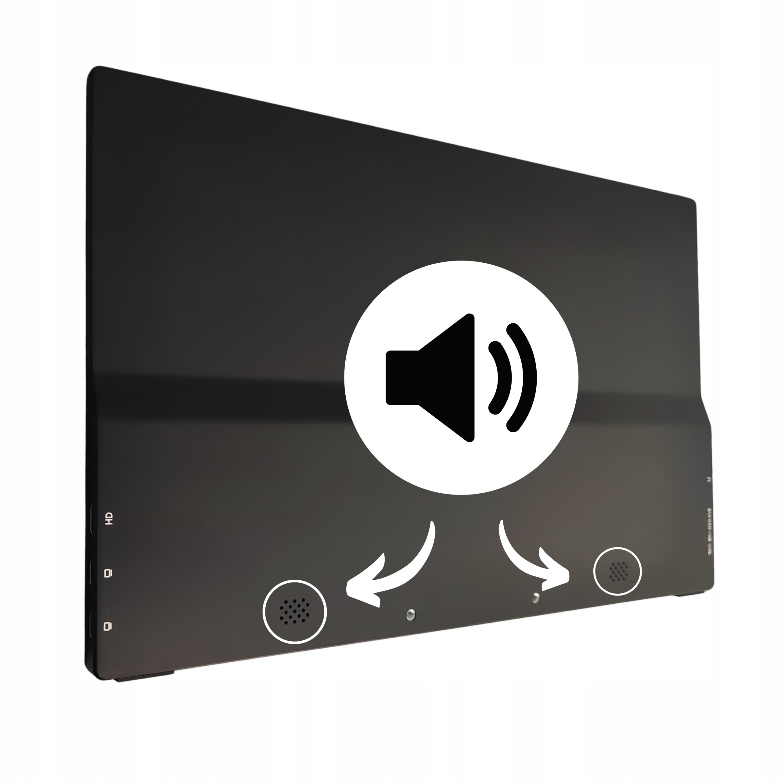 Монітор оснащений 2 динаміками потужністю 2 Вт, розташованими в задній частині корпусу. Завдяки їм ви можете переглядати фільми, грати в ігри або проводити відеоконференції без підключення зовнішнього аудіообладнання, що робить монітор ще більш практичним для подорожей і повсякденного використання.