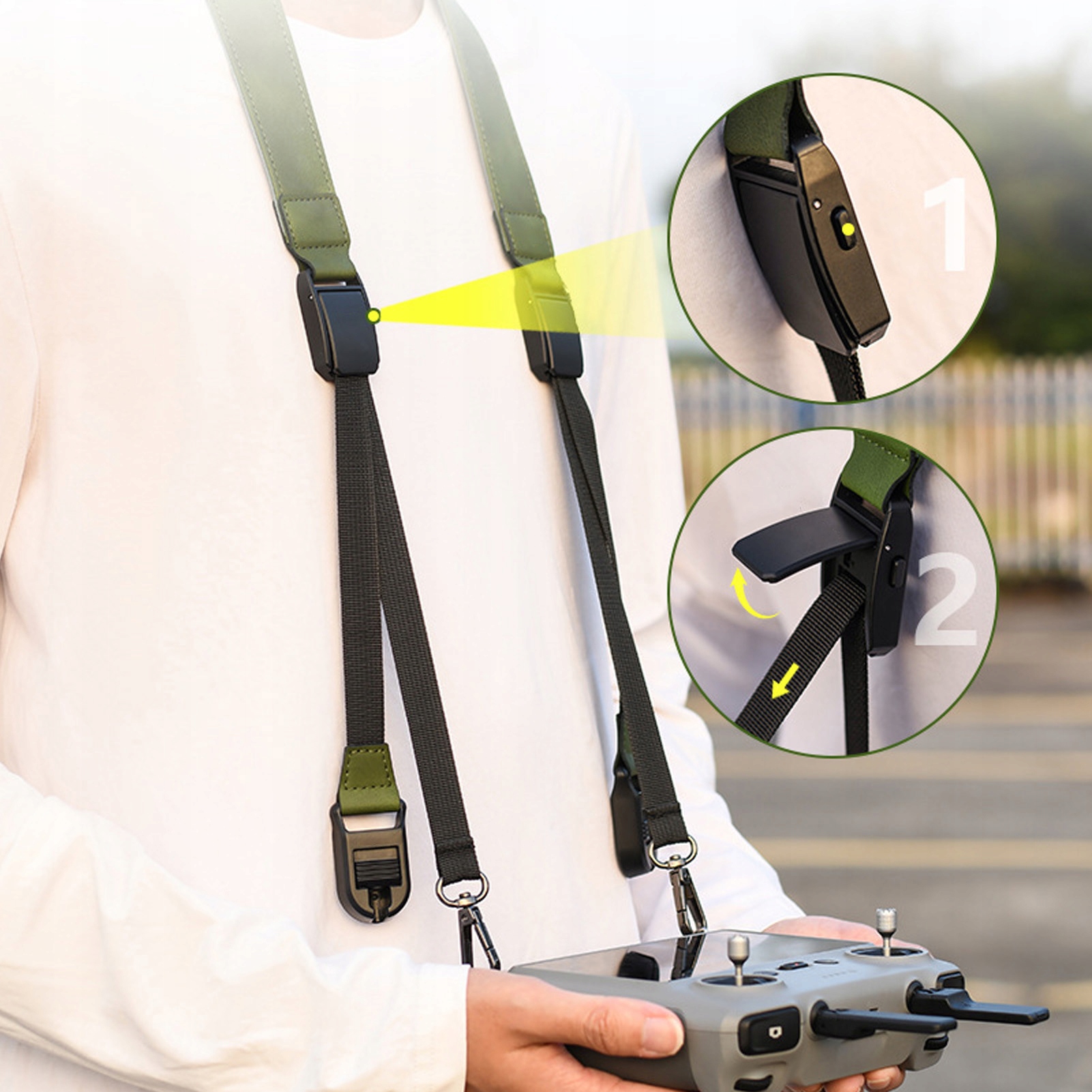 3. Регульована довжина: з діапазоном довжини 80-140 см (відрегулюйте довжину будь-якого кінця, інший кінець скоротить довжину), цей ремінь можна відрегулювати відповідно до ваших потреб і пристроїв для комфортного носіння. Цей ремінь, конструкція з подвійною головкою, дозволяє легко закріпити контролер дрона.
