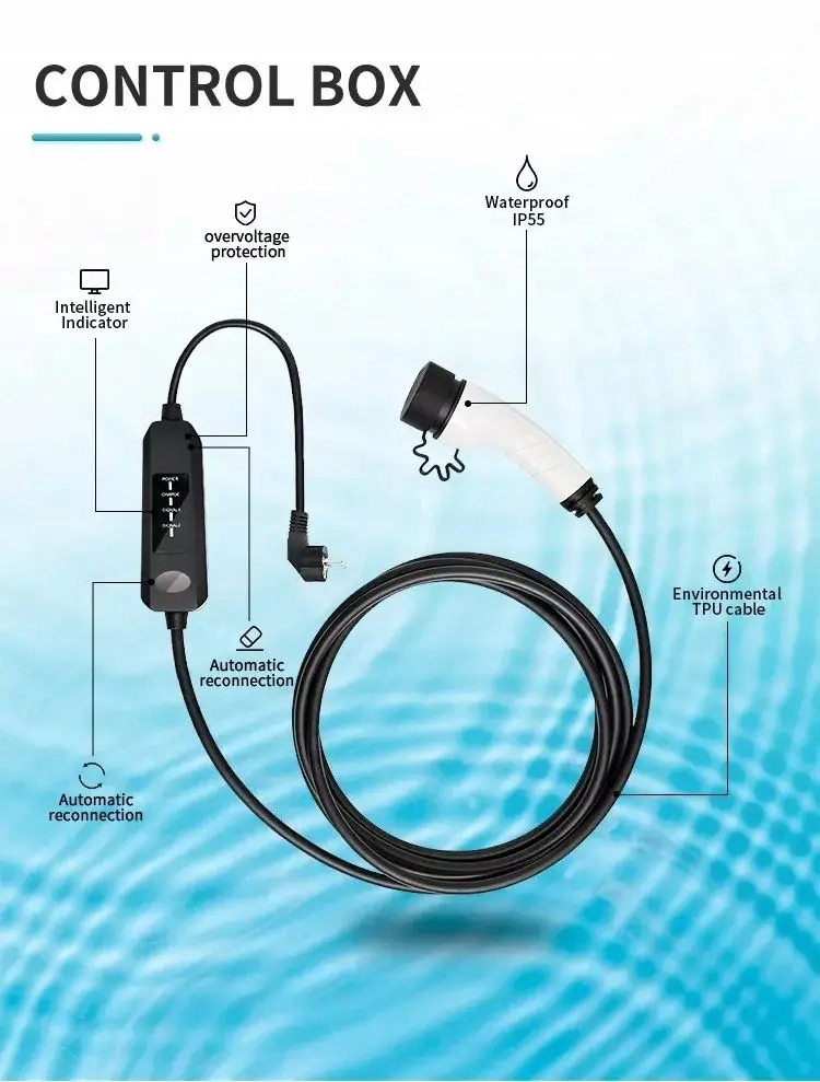 зарядний пристрій EV виготовлений з високоякісних матеріалів, водонепроникних, пилозахисних, міцних та довговічних.