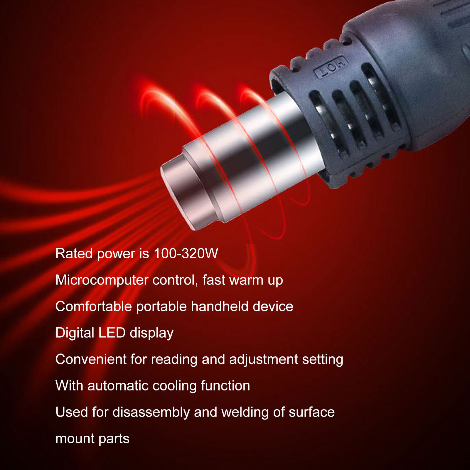 1. Швидке нагрівання: Номінальна потужність сонця становить 100-320 Вт, він контролюється мікрокомп'ютером, а нагрівання дуже швидке. Цифровий світлодіодний дисплей: оснащений цифровим світлодіодним дисплеєм для легкого регулювання та налаштування налаштувань, простих у використанні. Функція автоматичного охолодження: Вентилятор гарячого повітря має автоматичну функцію охолодження, яка може продовжити термін експлуатації нагрівача та захищати паніку. Зручна робота: Він має зручну ручку Windbreaker і оснащений ручкою, яка дозволяє працювати у вузькій області. Для вирішення та зварювання: він підходить для демонтажу та паях більшості поверхонь для поверхневої збірки, таких як SOIC, мікросхема, малі та середні QFP, PLCC, невеликий BGA тощо
