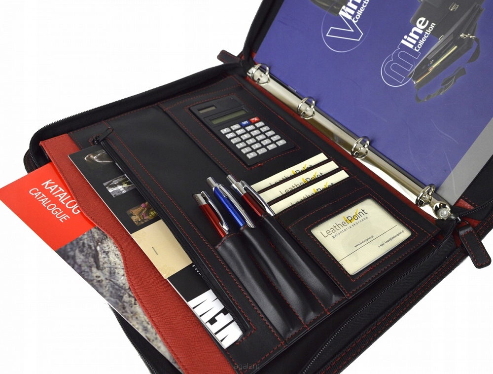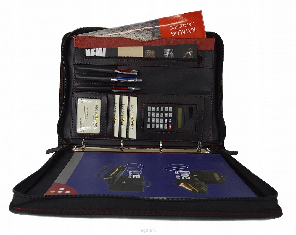 Портфель ES-09 LUGO виготовлений з екологічної чорної шкіри з контрастними червоними вставками, що надає йому динамічності. Він елегантно виглядає, надзвичайно функціональний і легко чиститься.