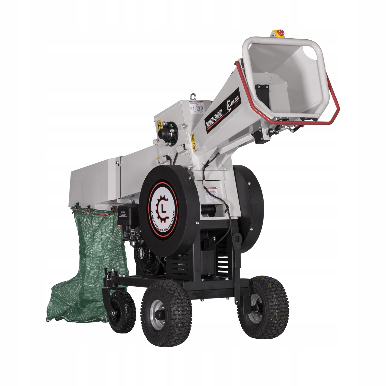 Дуже потужний подрібнювач дров Lumag RAMBO-HM200, оснащений бензиновим двигуном потужністю 13 HP і 2 ножами барабани.