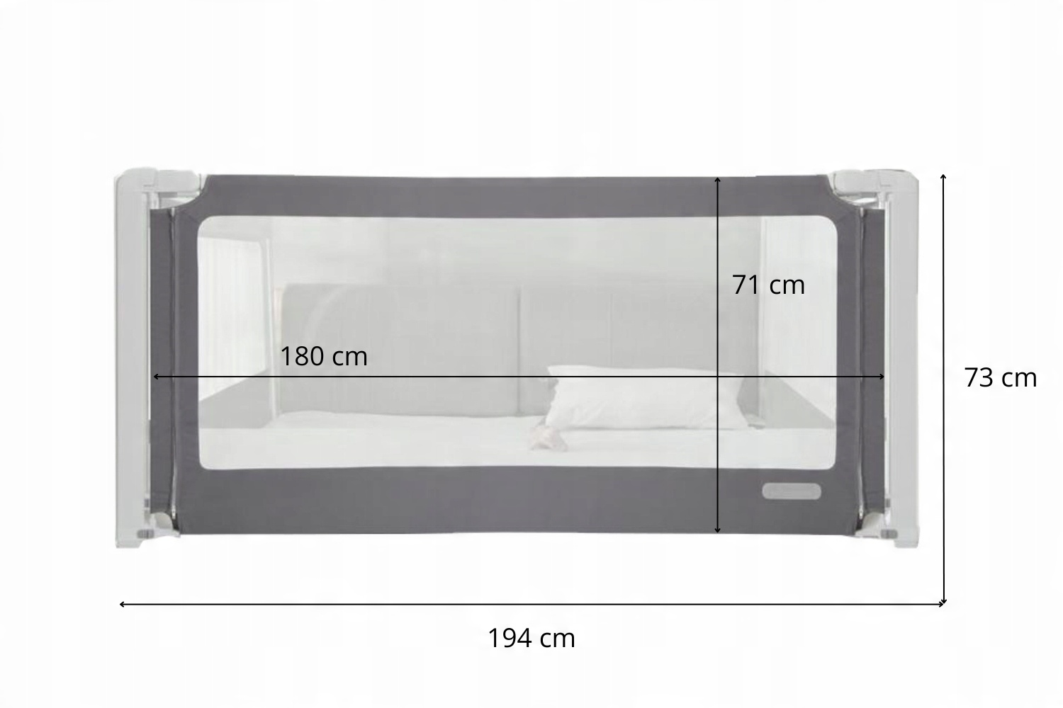 - Загальна довжина: 194 см (бар’єр має бути на кілька см коротшим, щоб підходити до матраців довжиною 200 см)