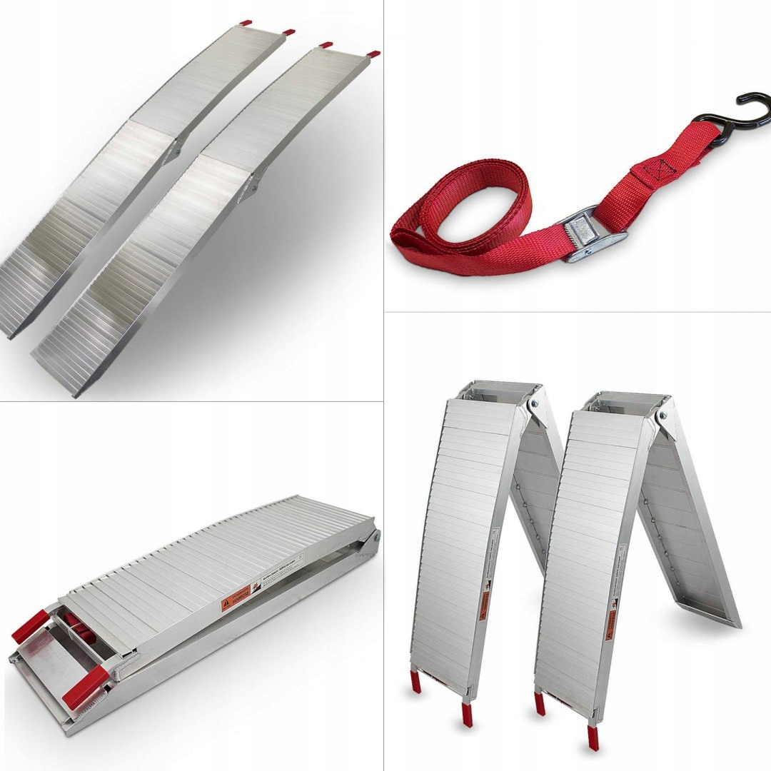 Набір алюмінієвих пандусів загальною вантажопідйомністю 680 кг. Ідеально підходить для завантаження мотоциклів, газонокосарок, скутерів, будівельного обладнання, інвалідних візків та інших транспортних засобів.
