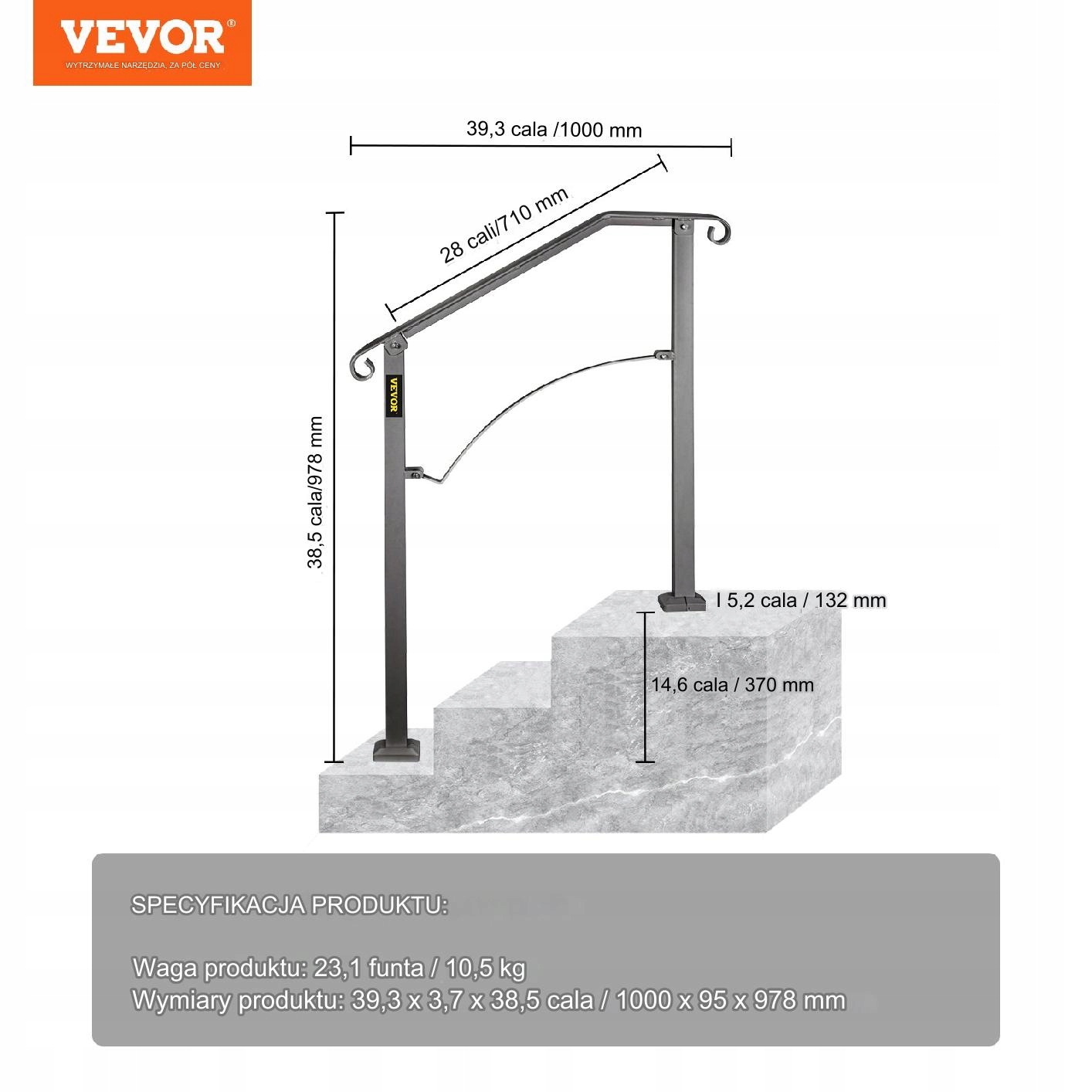 Максимальна висота сходинки: 37 см; Відстань між стійками: 71 см; Висота верхньої стійки: 97 см; висота нижньої стійки: 97,8 см. Завдяки гнучкій висоті наші поручні з кованого заліза вміщують 2 або 3 сходинки залежно від розміру. Він ідеально підходить, щоб допомогти людям зберегти рівновагу під час дощу чи взимку та запобігти ковзанню.
