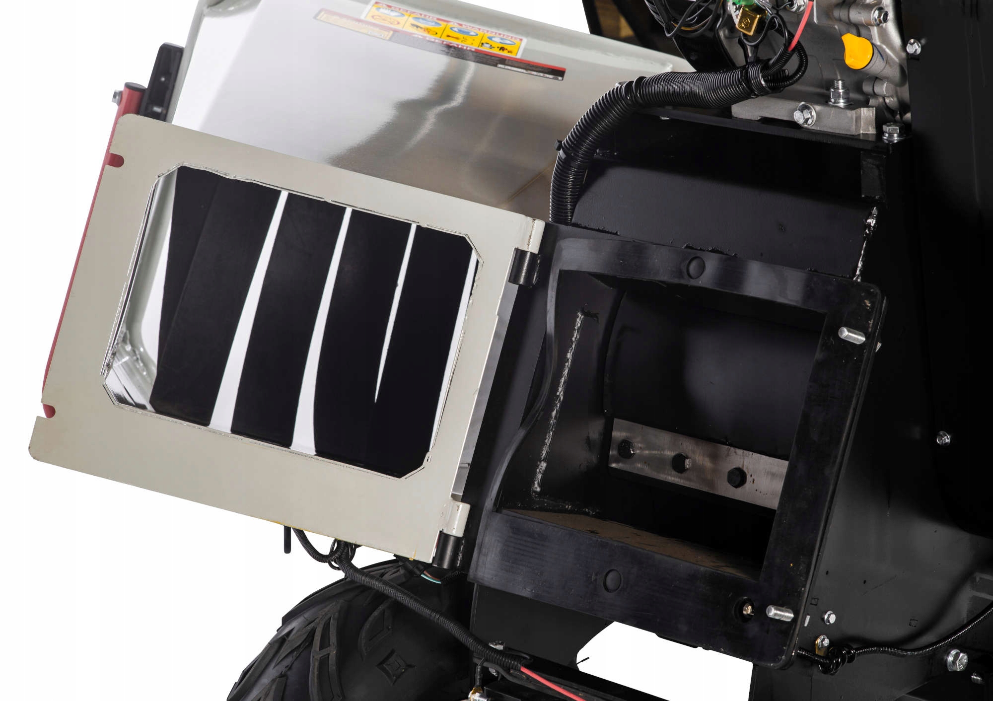 Подрібнений матеріал викидається через вихідний бункер завдяки відцентровій силі. Викидний бункер регулюється в залежності від того, чи потрібно помістити тріску в тачку, мішок або безпосередньо на причіп. Ви можете легко встановити кут і напрямок викиду.