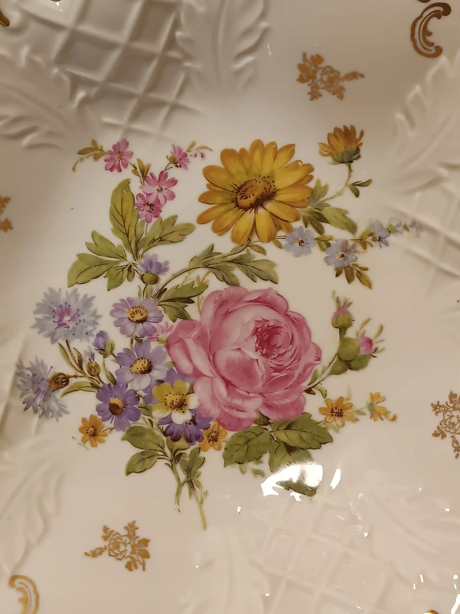 Ця багато прикрашена декоративна тарілка або тарілка на ніжках, зразок розкішної порцеляни, була виготовлена на знаменитій фабриці Райхенбах у Тюрінгії.
