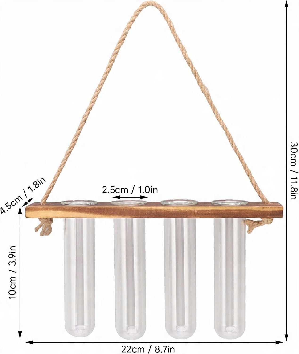 - Мінімалістичний вигляд: дерев'яна полиця в поєднанні з 4 прозорими скляними трубками. Прекрасний спосіб продемонструвати штучні або свіжозрізані квіти, змішані букети та водяні рослини для домашнього декору у вітальні, спальні, туалеті, їдальні, кухні чи офісі.