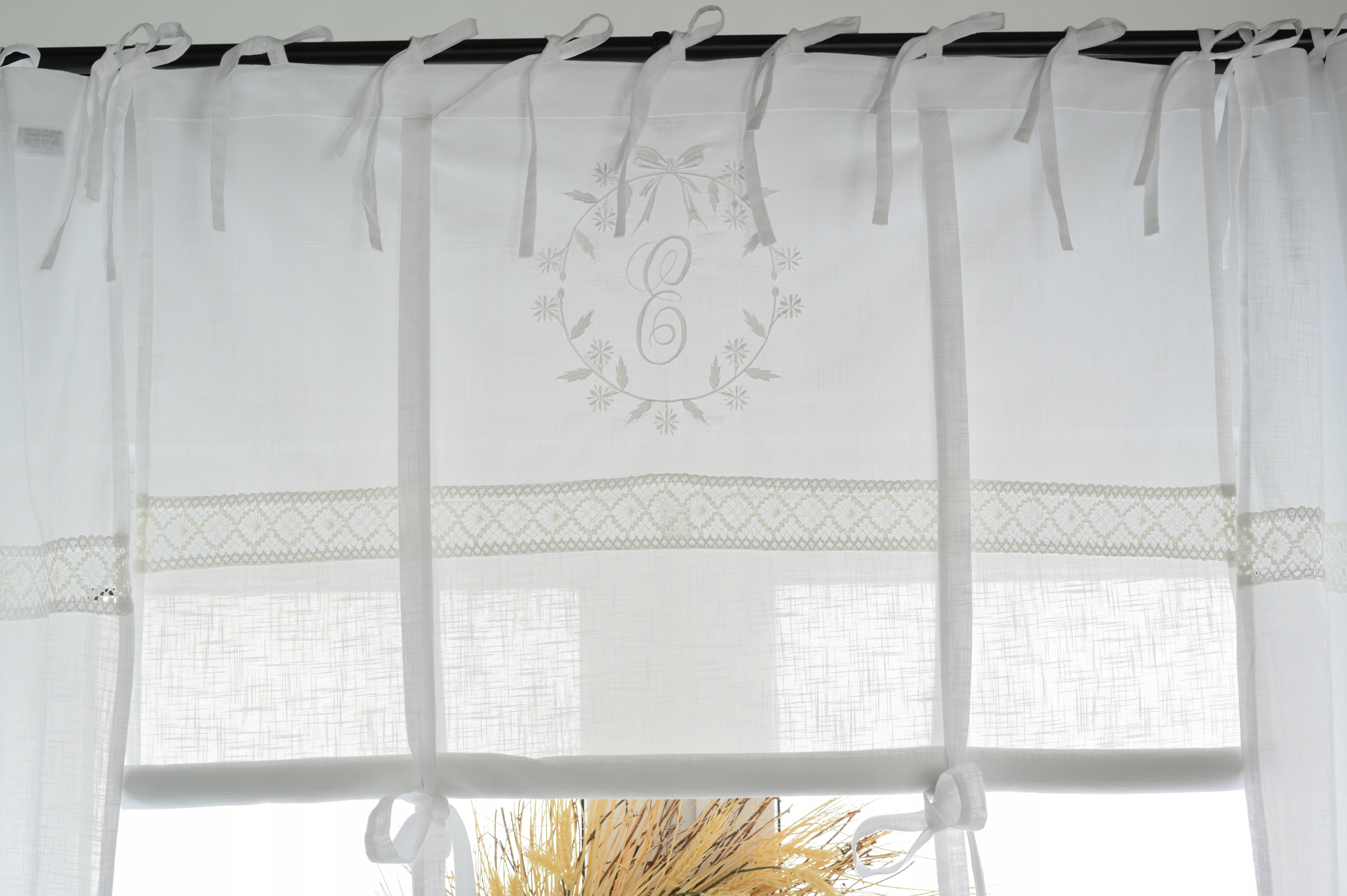 Стиль Бохо та Провансальний стиль давно настає в наших серцях, тепер настав час його реалізувати. Прекрасний вишитий вінок з букви Е. Нижче - романтичне мереживо, яке спокушає його благодать. Завіса кріпиться стрічками на штор. Структура матеріалу дуже схожа на конструкцію білизни, яка робить завісу повітряною і красиво розташованою.