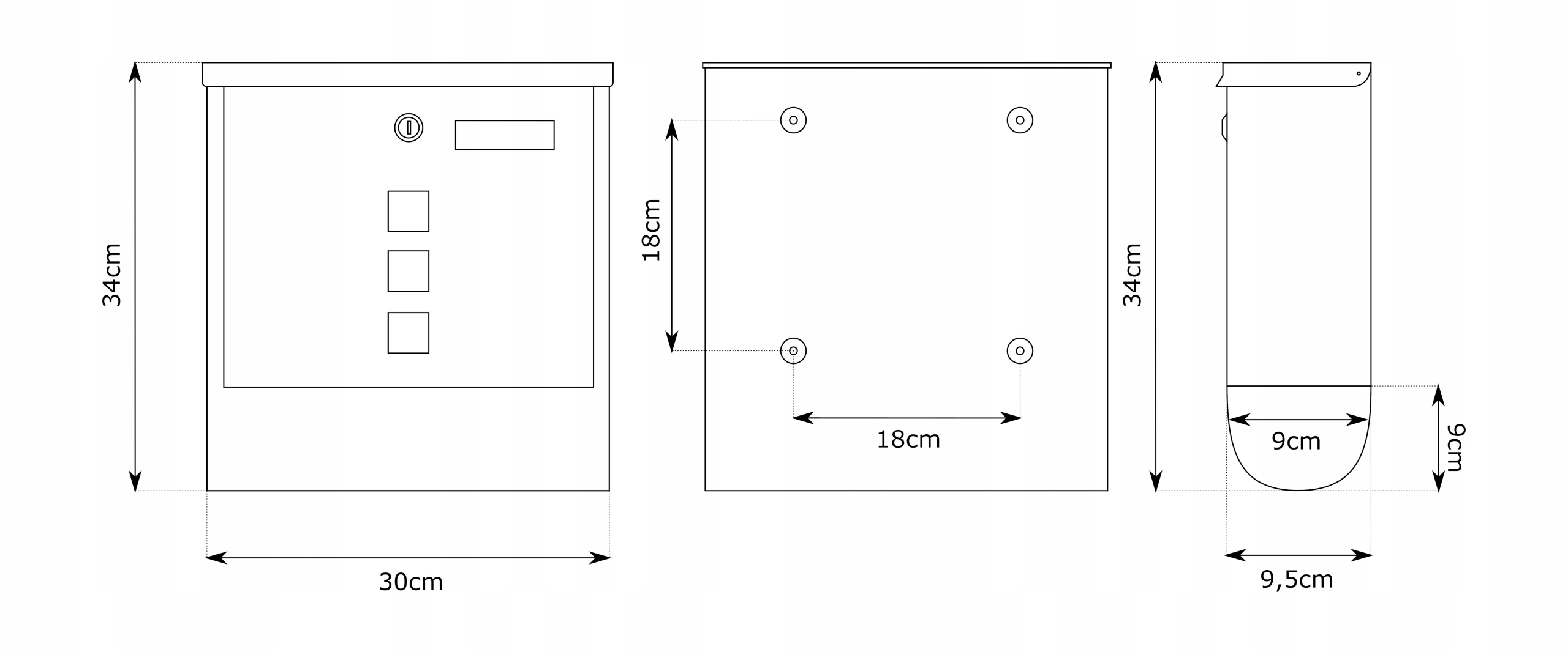 Оснащений трьома вічками, що показують вміст, і місцем для записки з особистими даними. Кришка та двері мають гумові амортизатори, завдяки яким не буде зайвих шумів під час руху вітру чи воріт. У набір входить весь монтажний набір (штифти, розпірки, гвинти) і два ключі для замка європейського стандарту, які при необхідності можна легко отримати у будь-якого виробника ключів.Дуже проста збірка! - підготовлені отвори для кріплення. b>