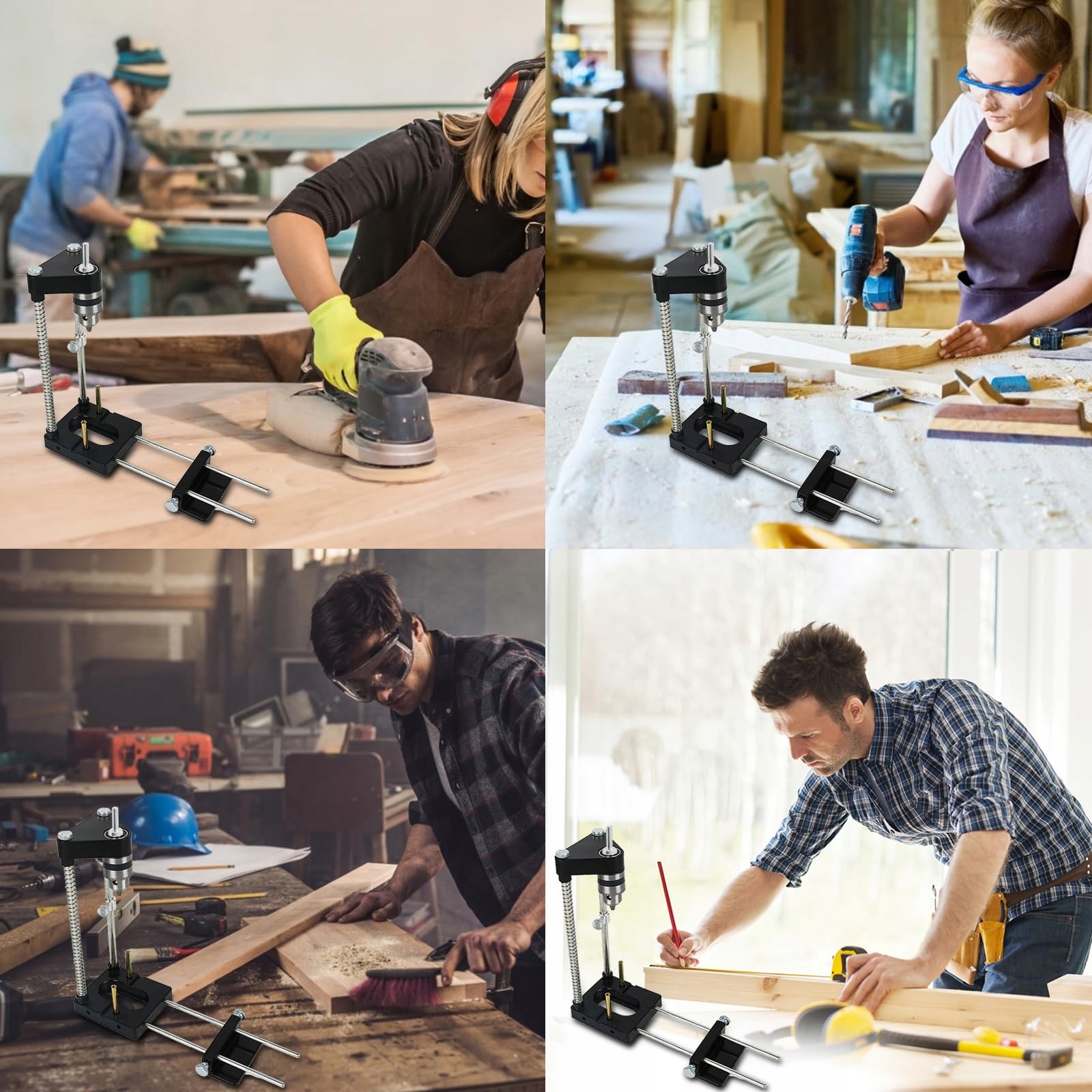 Зажим для свердла виготовлений із міцного алюмінієвого сплаву та пластику, що робить його легким, міцним і стійким до корозії. Підходить для комплектів позиціонування країв, поверхонь, Т- та L-з’єднань у деревообробці, що дозволяє швидко складати меблі та проекти DIY.
