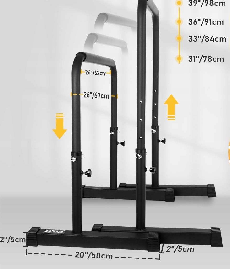 Регульоване керівництво потужністю DIPS - це універсальна станція для силових тренувань вдома та в тренажерному залі. Тверда квадратна основа забезпечує стабільність під час фізичних вправ, а можливість регулювати висоту в діапазоні 77-98 см дозволяє налаштувати обладнання на власні потреби та висоту.