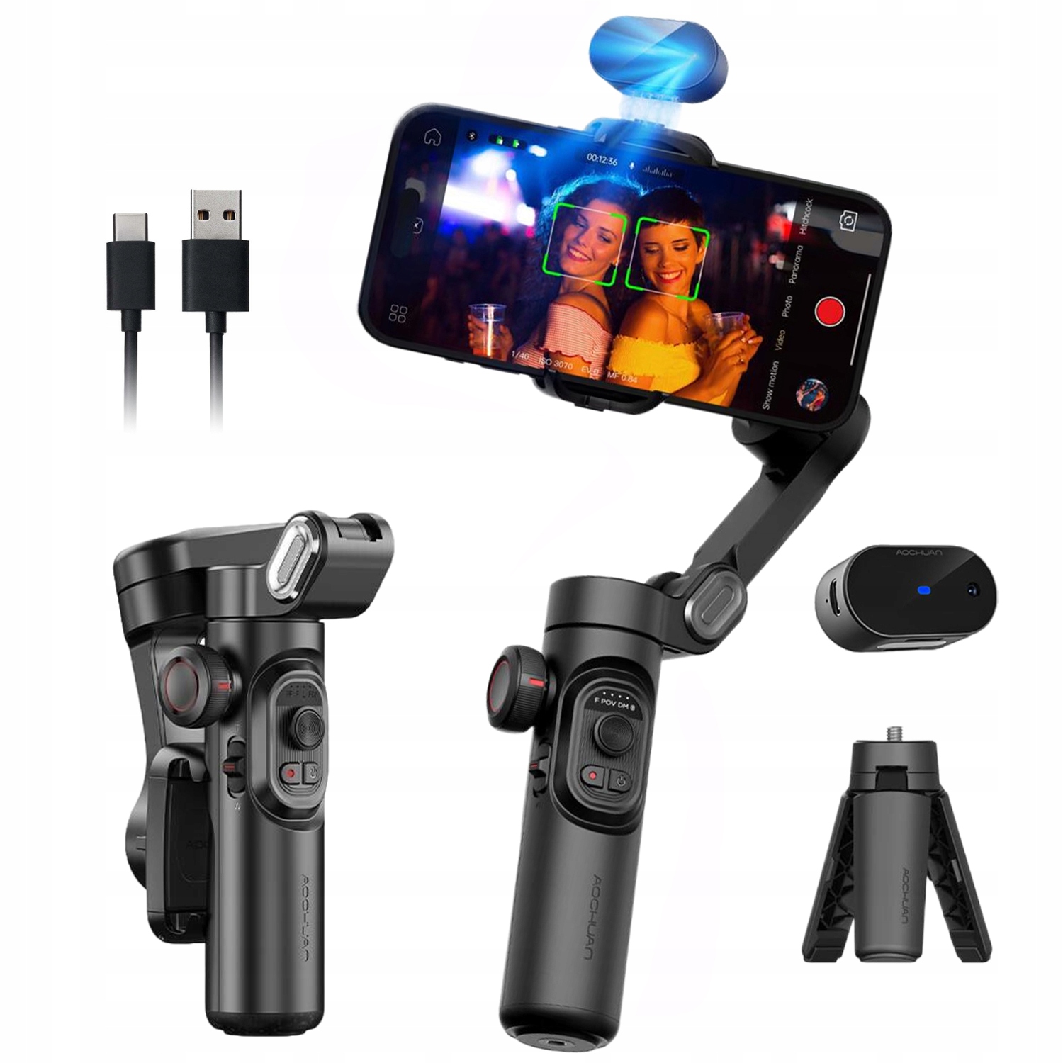 gimbal aochuan smart Xe для використання з iOS та Android системами. Пакет програмного забезпечення та підтримки включає Gimbal Aochuan Smart XE (телефон не включений), TRIPOD, S Mart AI Vision , кабель USB-C для зарядки та посібник користувача Gimbal XE та посібник користувача AI Vision.