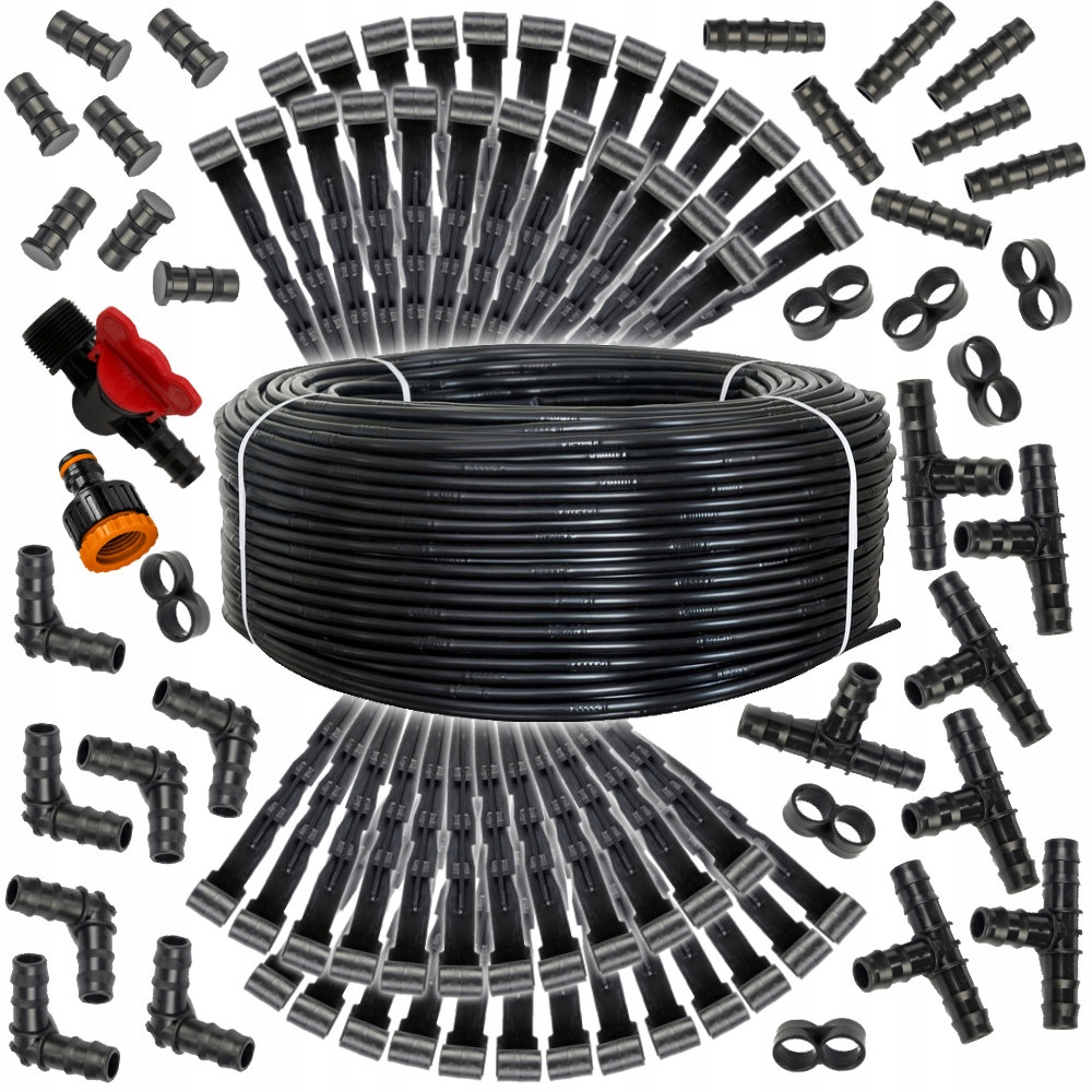 Набір включає 100 м крапельної лінії Ø 16 мм з крапельницями, розташованими через кожні 30 см, з продуктивністю 2 літри/годину та повне швидке підключення до гнучкого садового шланга