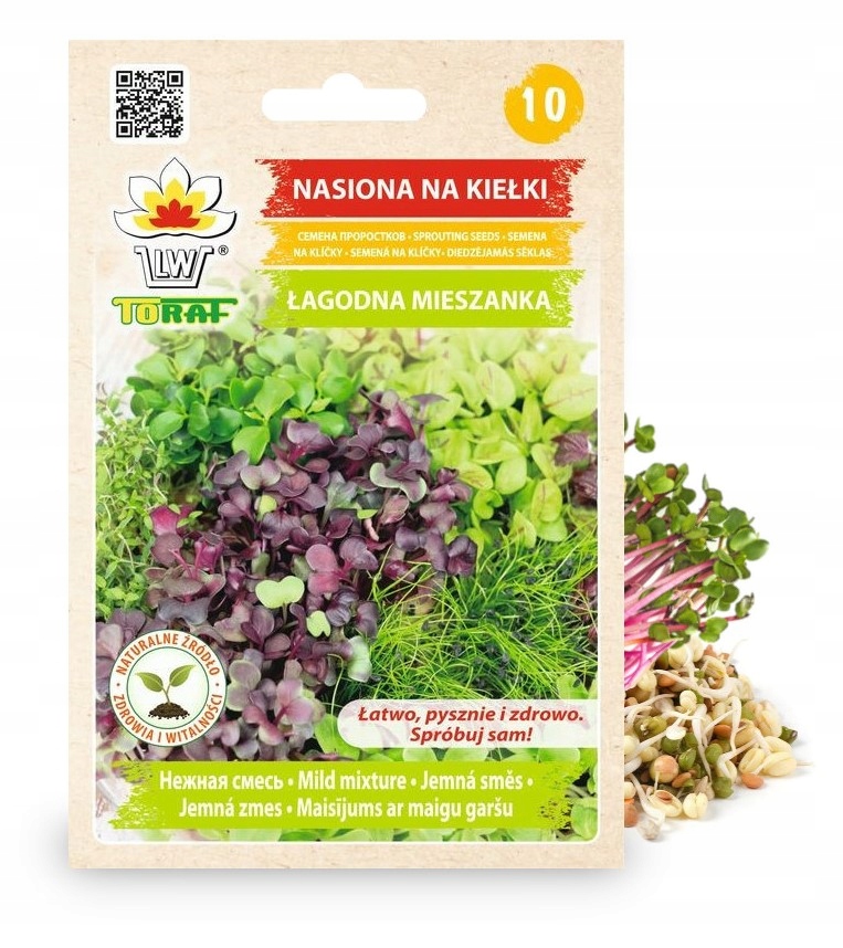 Суміш насіння для паростків, що складаються з видів, що утворюють м'який смак. Завдяки різноманітності видів, що складають цю суміш, ми отримуємо велику дозу цінних поживних речовин, мінеральних солей, амінокислот та вітамінів в одній порції. Вони містять велику кількість кальцію, заліза, магнію, калію, сірки та багатьох мікроелементів (йод, марганець, літій, селен). Регулярне споживання паростків зменшує кількість поганого холестерину (антисексуальні роботи), регулює процеси травлення. Легко - навіть недосвідчені люди можуть впоратися з цим. - 10%, Lens Culinaris Green (зелена сочевиця) - 5%, лінза Culinaris Red (червона сочевиця) - 5%, Raphanus sativus (редька) - 5%, Raphanus sativus var sativus (редька) - 5%