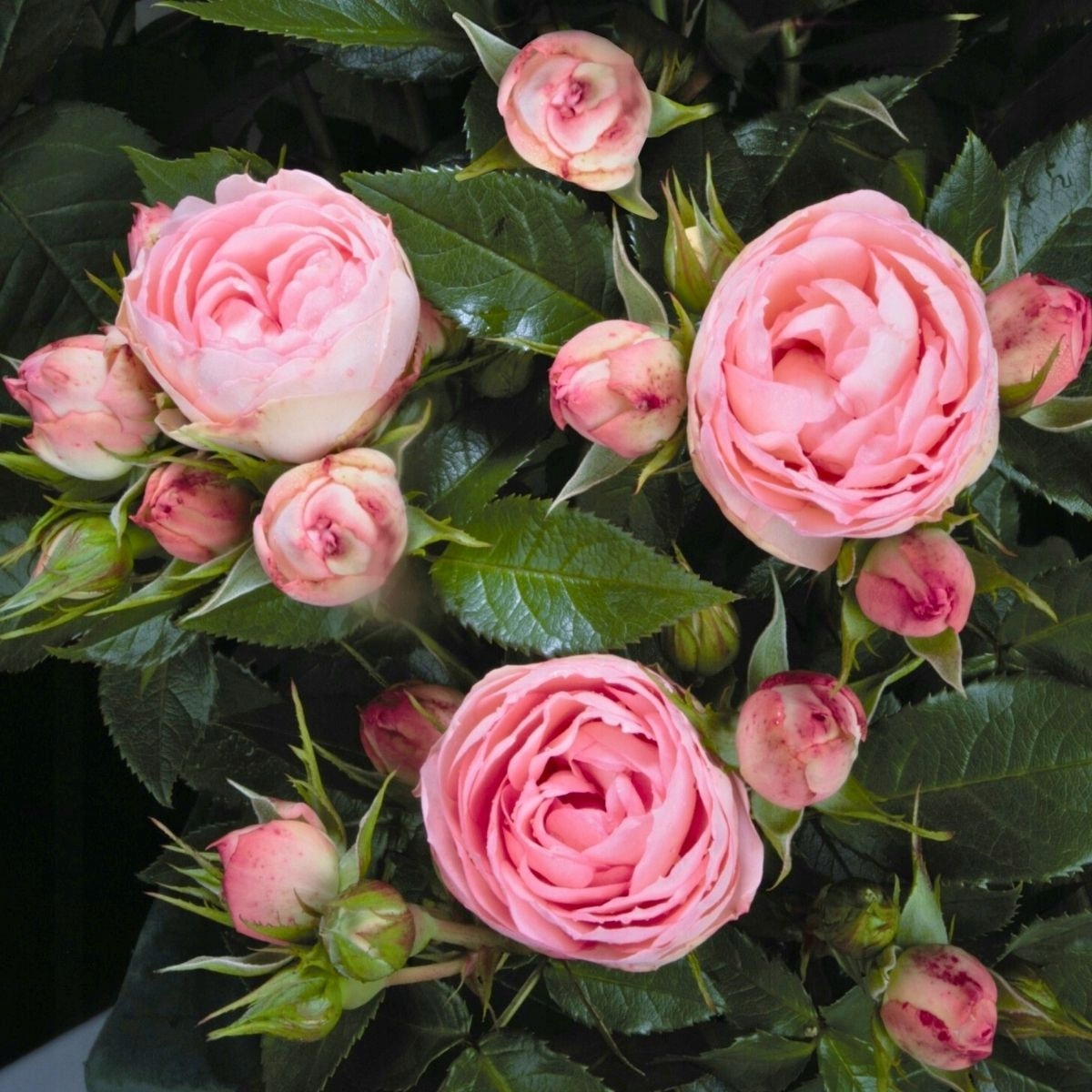 - Квіти: повні, щільно сформовані, у відтінках рожевого з ніжною, кремовою серединкою; діаметр 6-8 см, з приємним, легким ароматом.