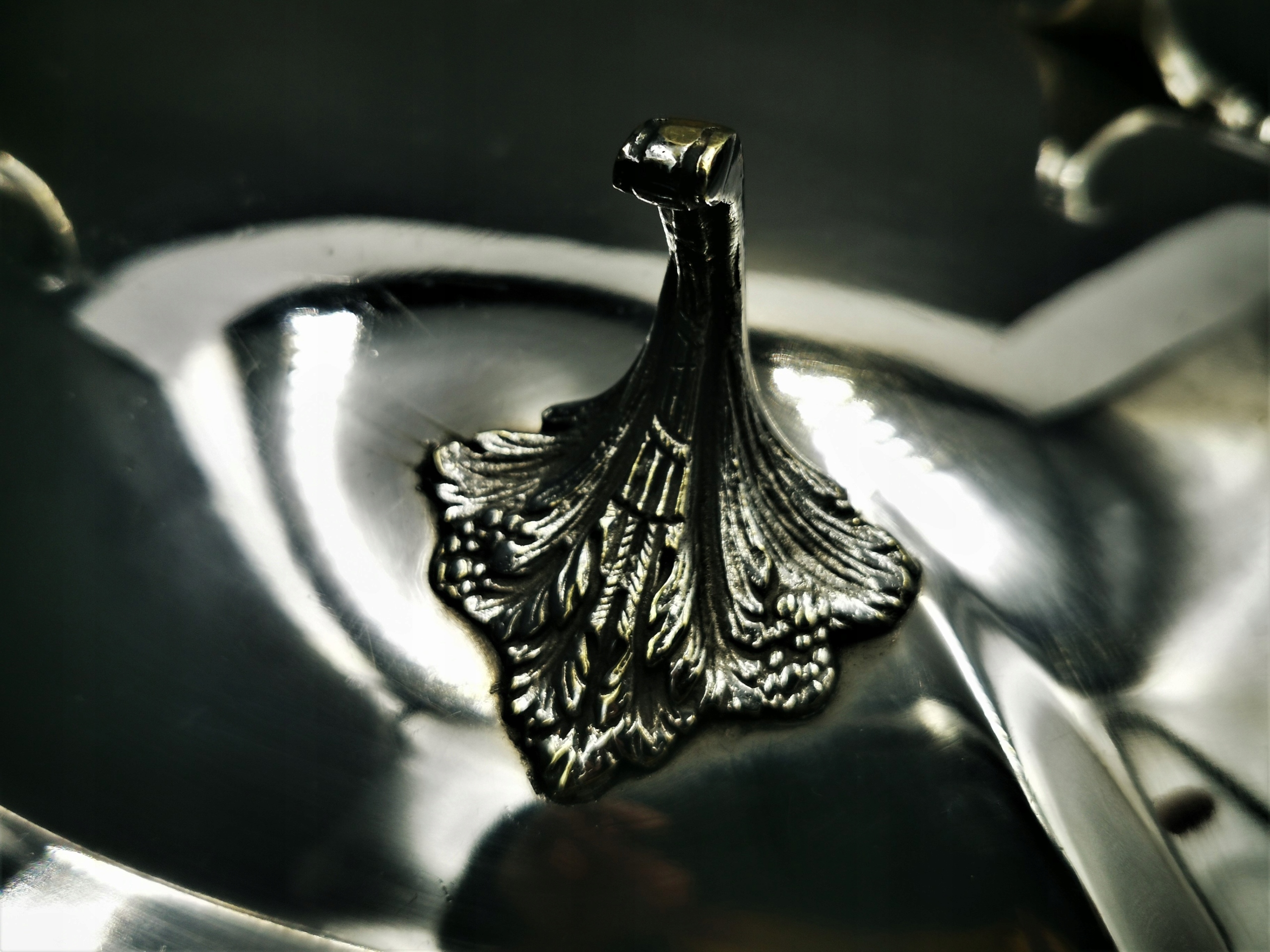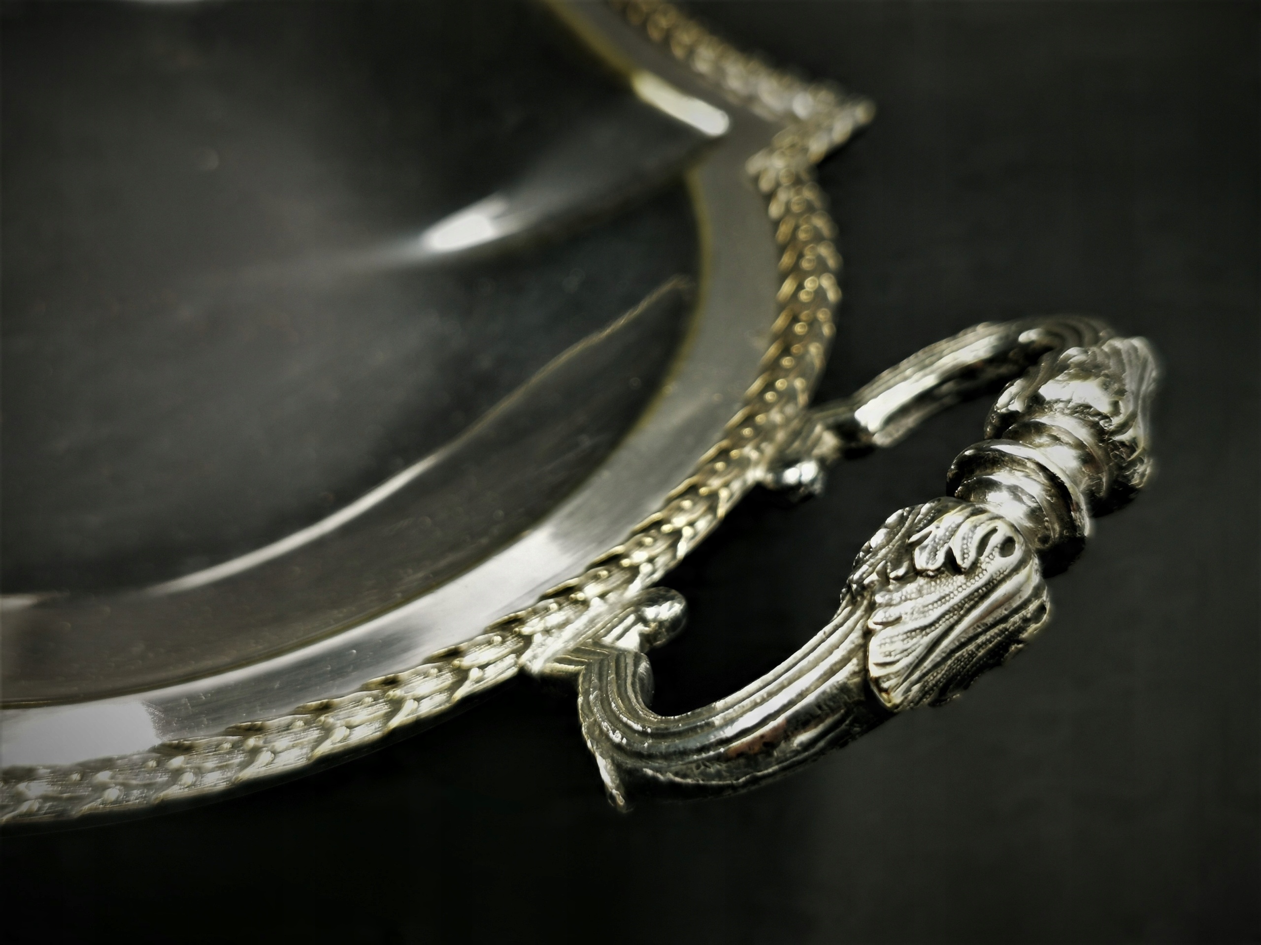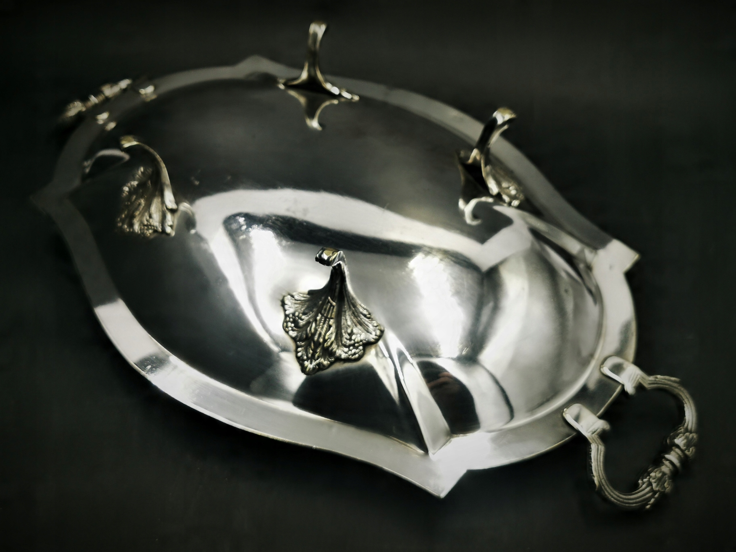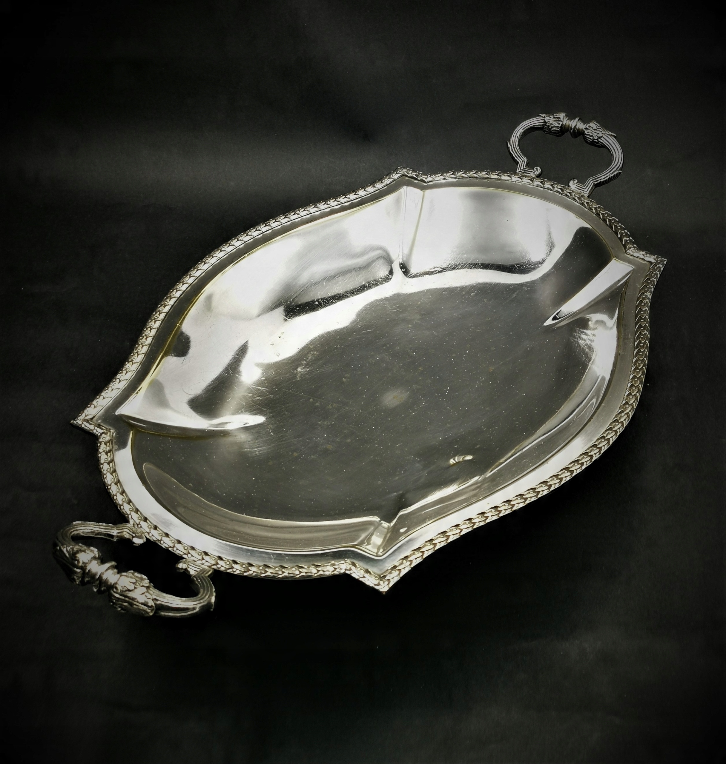 Представляємо прекрасну фруктову тарілку, виготовлену з тонко посрібленого металу. Плита досить важка і міцно виготовлена. він підкуповує своїм декором по краях і витонченими ручками з листям аканта. 4 ніжки, на яких кріпиться тарілка, роблять блюдо неймовірно легким. Стан дуже хороший - звичайні сліди використання.