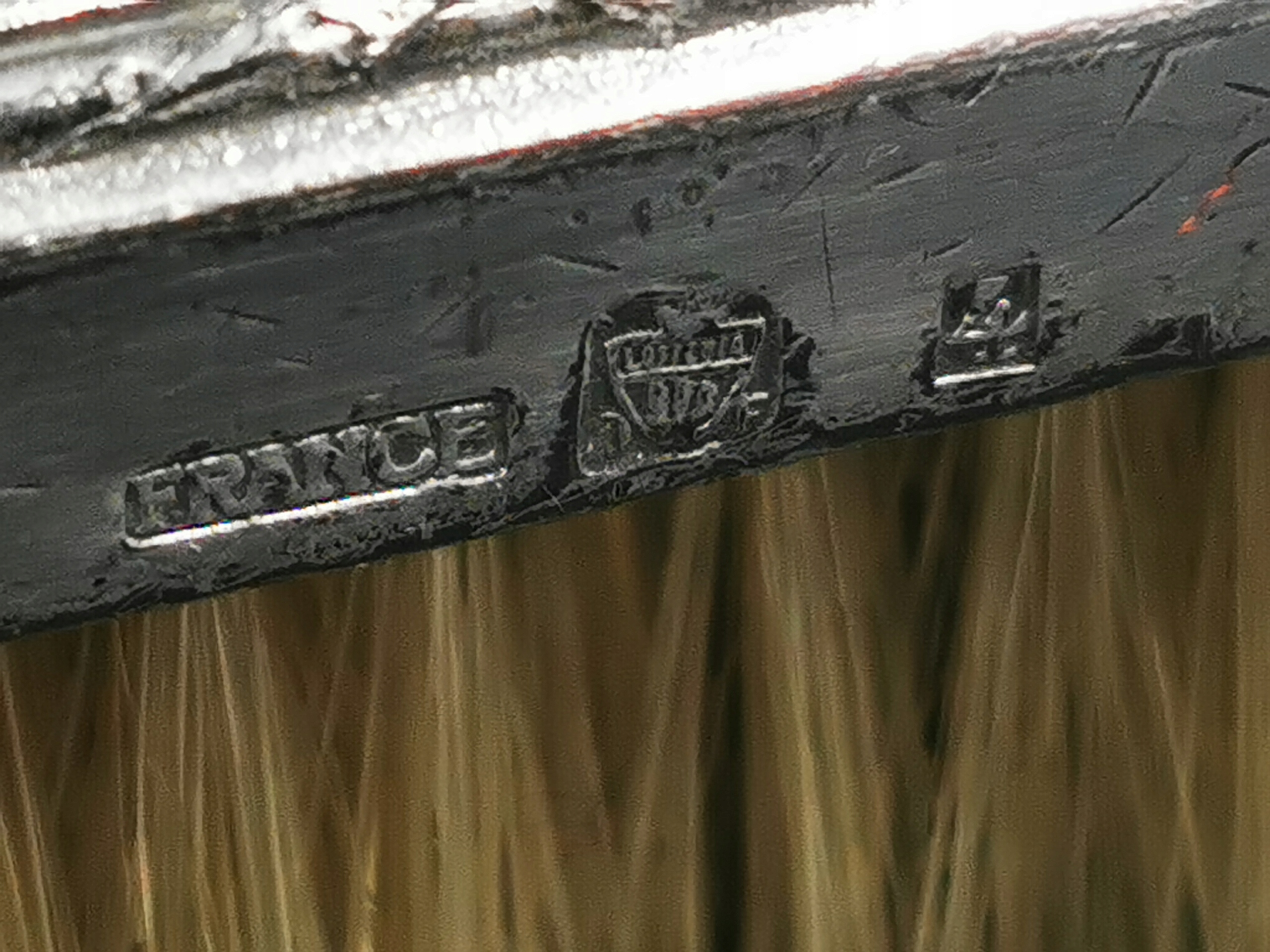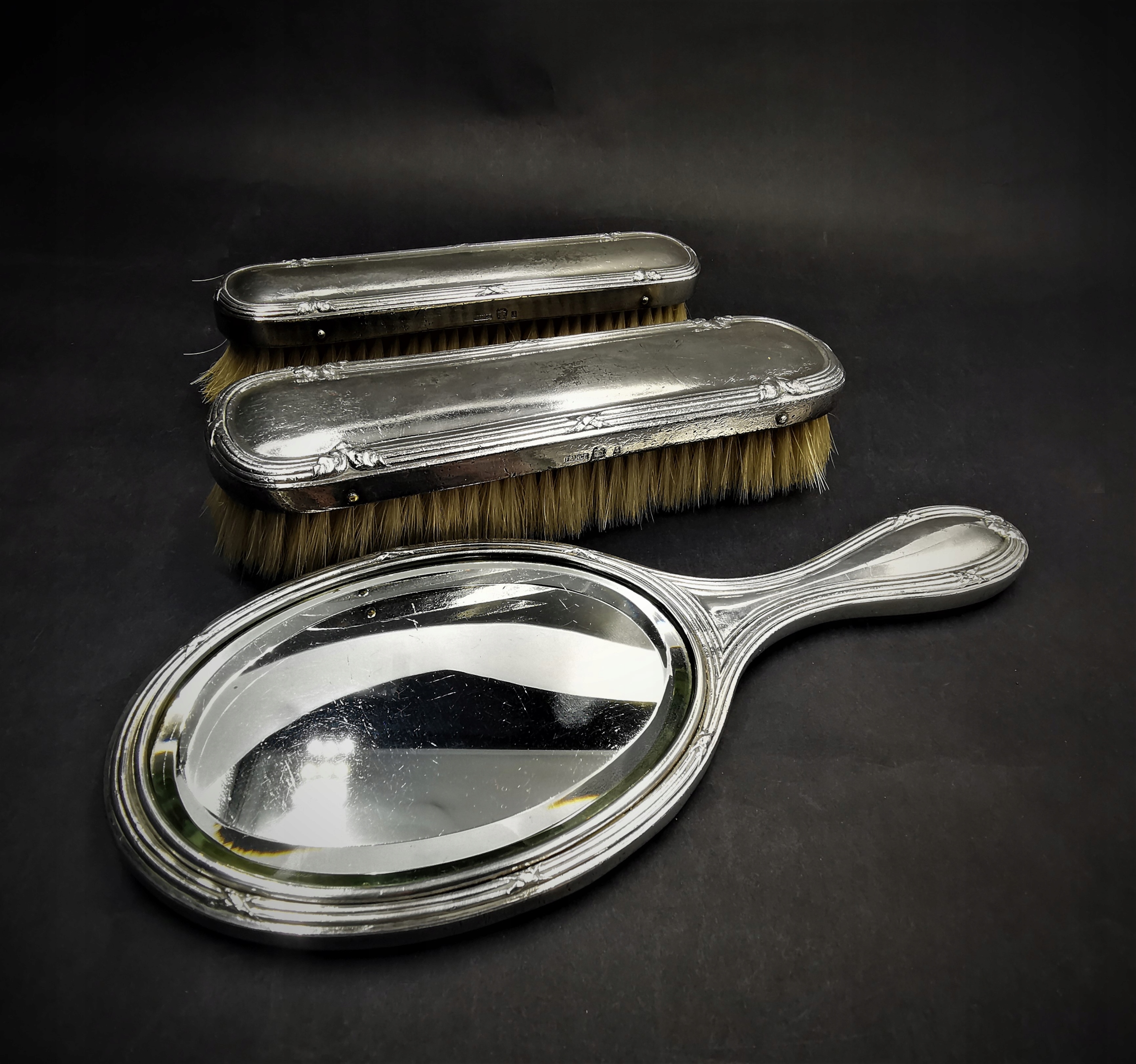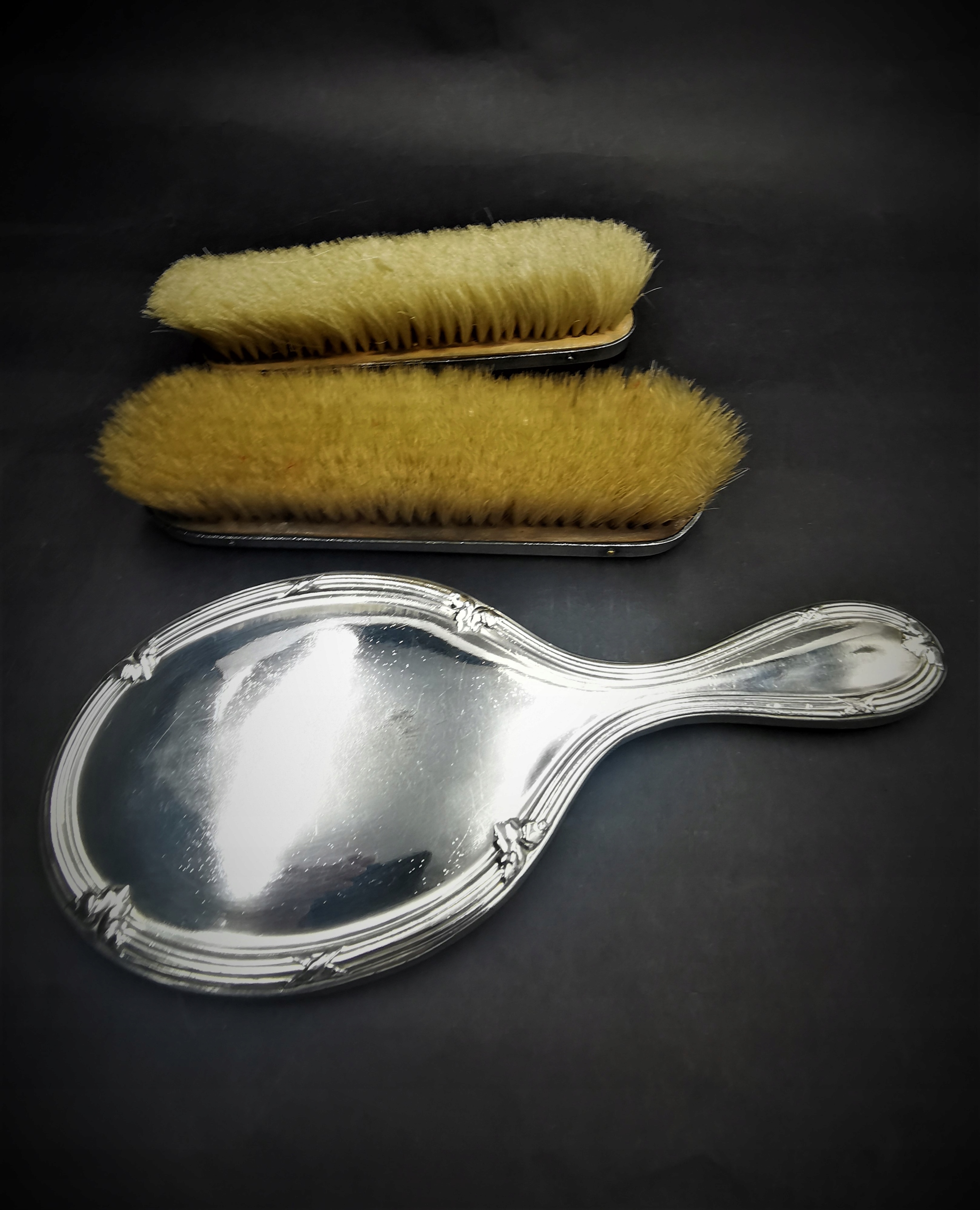 Феноменальний французький набір для чищення одягу з покритого срібла. Набір складається з двох довгих пензликів з натуральною щетиною і дзеркалом з фрезерованого кришталю. Набір помістили в оригінальний футляр, обшитий червоним оксамитом, зі зручною ручкою на кришці. Стан описується як дуже добрий - з нормальними слідами часу та віку, особливо тими, що позначені на корпусі та у вигляді дрібних подряпин на інструментах.