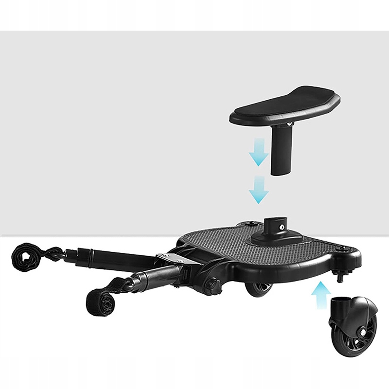 Суцільна конструкція витримує навантаження до 25 кг, що робить його ідеальним для дітей старшого віку, який іноді потребує хвилини відпочинку під час прогулянки. Універсальна система вкладення ремінців дозволяє швидко та просте кріплення до більшості коляски, доступних на ринку.