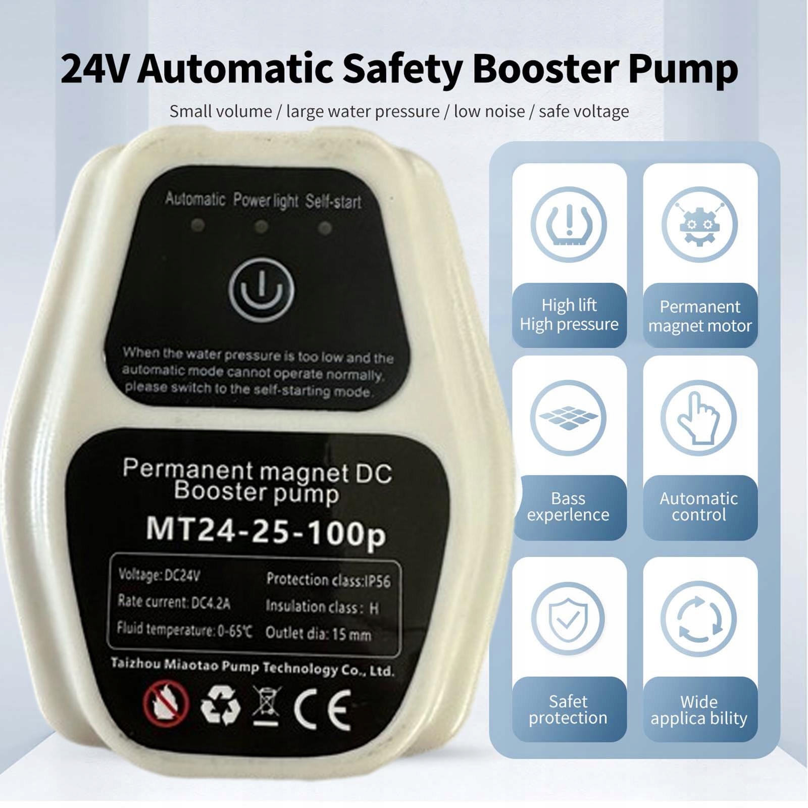 ВОДОСТІЙКІСТЬ IP56: безшумний автоматичний підкачувальний насос на 24 В постійного струму розроблений для роботи та не завдає шкоди людському тілу. водонепроникний матеріал, вбудований повністю мідний двигун, висока ефективність і низький рівень шуму.