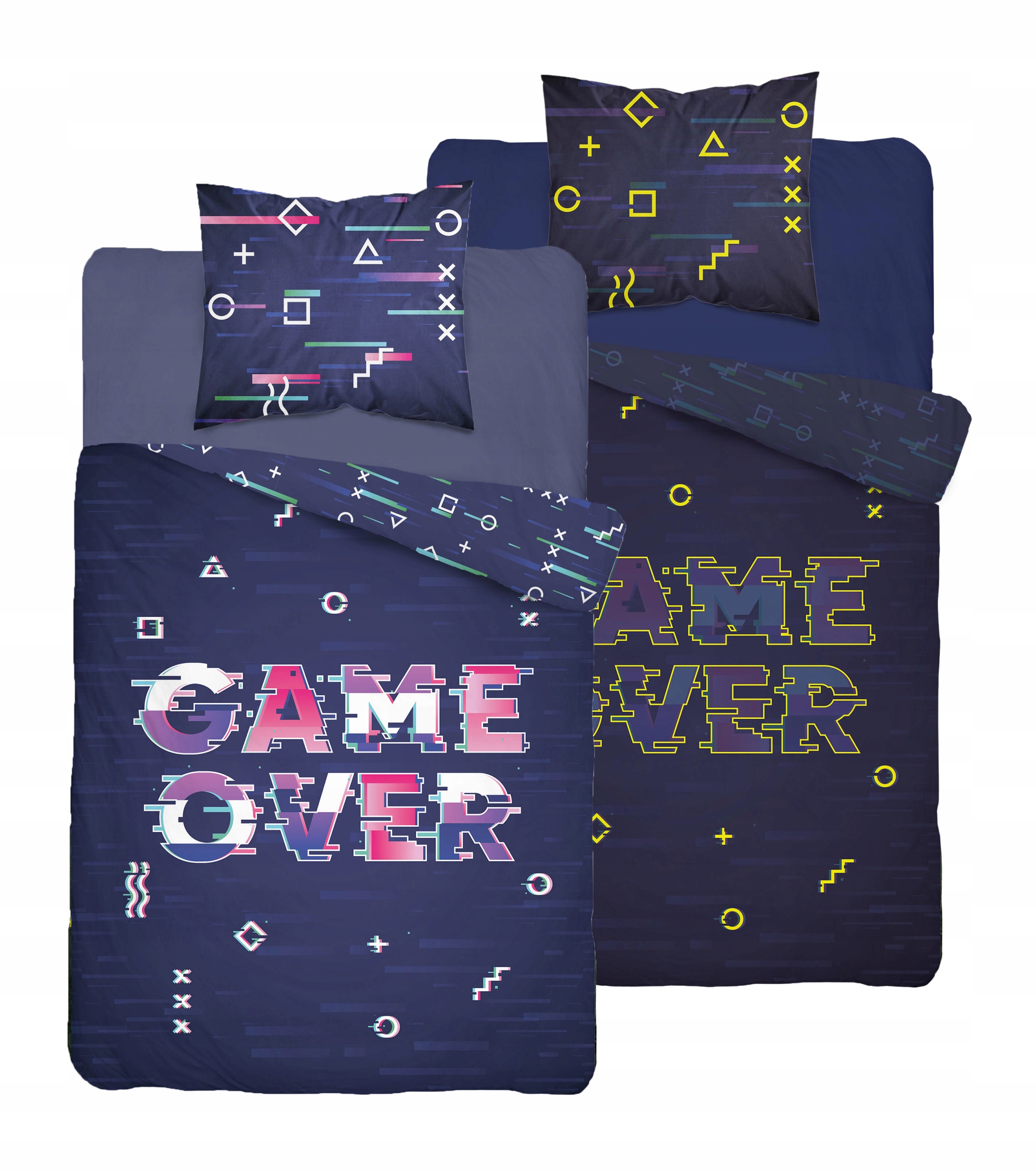 Цей дивовижний комплект постільної білизни оцінить кожен маленький фанат комп'ютерних ігор! Виготовлений зі 100% бавовни, має красиву барвисту графіку з написом GAME OVER. Дітям буде приємно засинати під такою постільною білизною, а ніч, проведена у світі ігор, неодмінно відновить сили, додасть енергії для ще одного активного дня! Крім того, яскраві, насичені кольори не збиваються, тому набір надовго буде прикрашати дитячу спальню. Пропонований комплект складається з однієї наволочки розміром 70 х 80 см і підодіяльника розміром 140 х 200 см, що застібається на блискавку. Постільна білизна приємна на дотик і не подразнює ніжну шкіру малюка. Набір можна прати в пральній машині при 40°C.