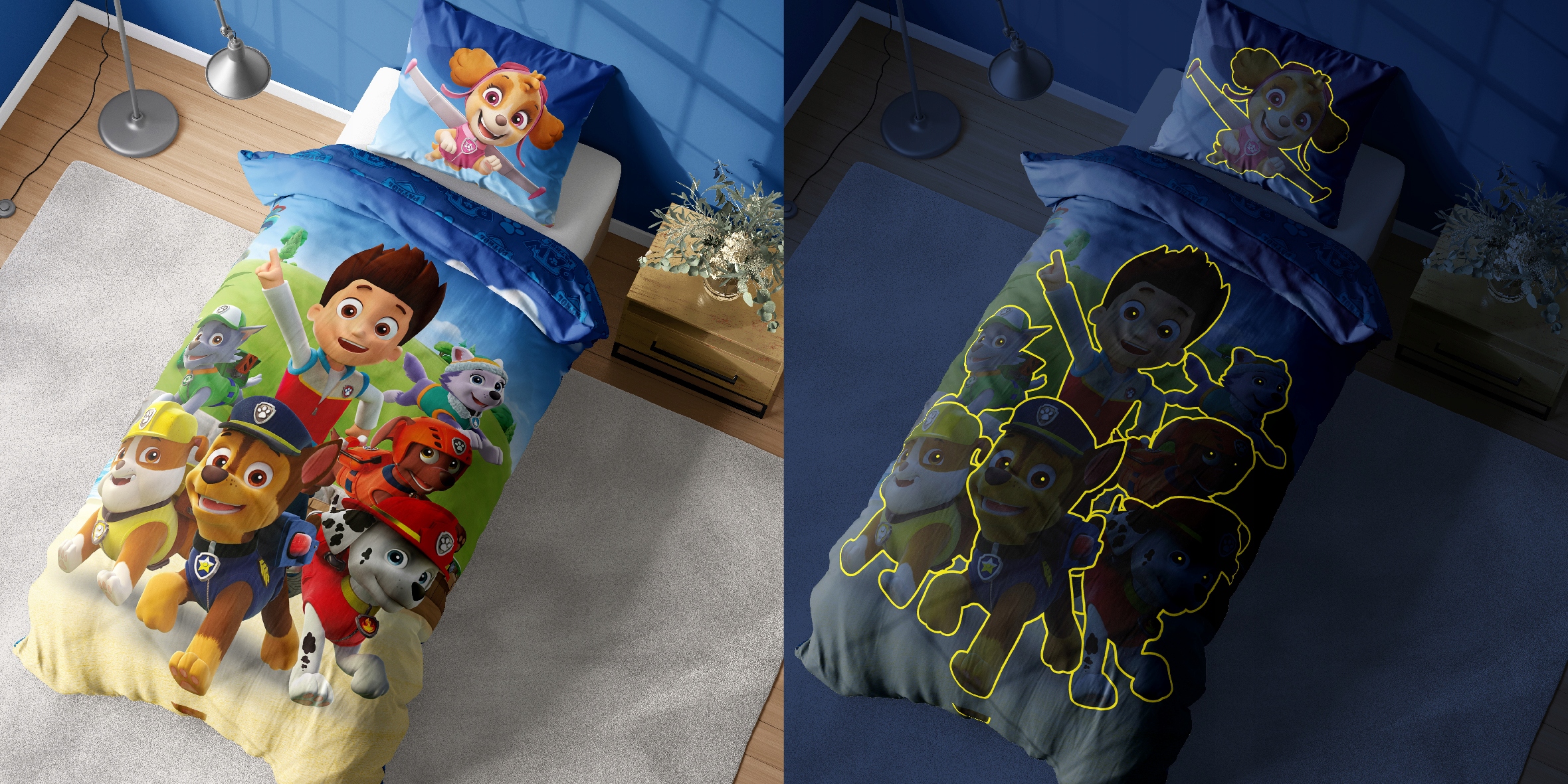 Увага! фото постільної білизни на темному тлі показує, які елементи на підстилці сяють у темряві після попереднього опромінення.