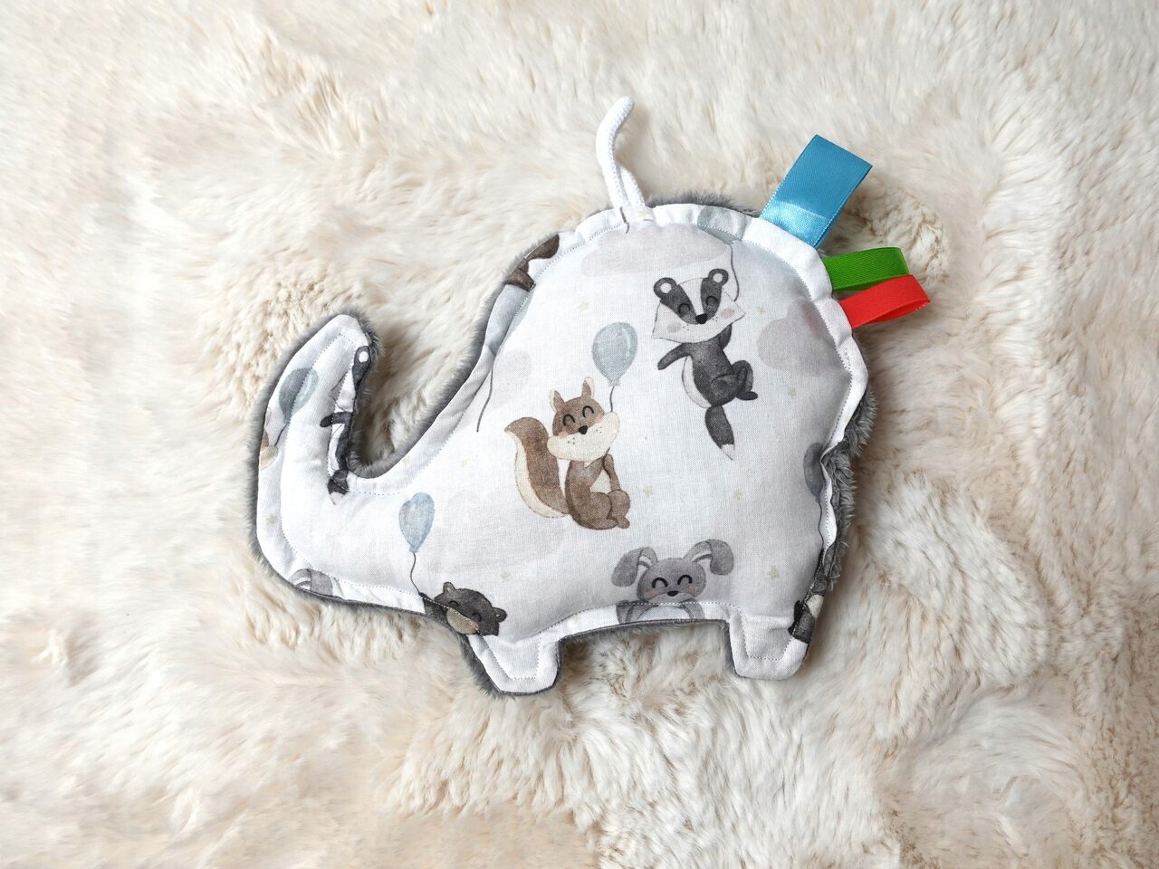 ✅ Слоненя має петельку, через яку його можна повісити в колясці або біля ліжка, і барвисті декоративні стрічки-бирки.