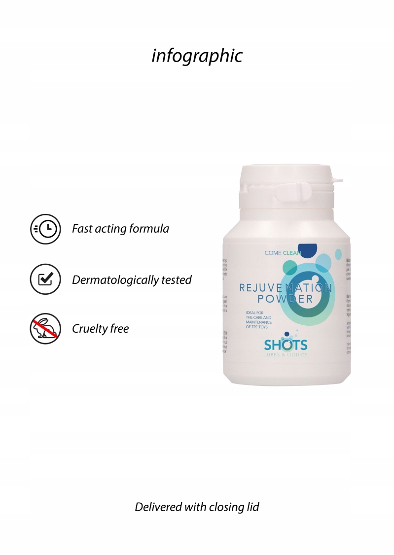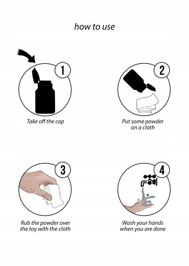 ідеально підходить для догляду та обслуговування всіх ваших еротичних іграшок! З усіх ваших цінних іграшок! Відновлює початкову структуру та еластичність іграшок і запобігає зневодненням. Як користуватися: Посипте трохи порошком і натирайте. Не забувайте про будь -які дірки, якщо це стосується. Більшість високоякісних ляльок виготовлені з TPE (термопластичного еластомеру) або платинового силікону. В обох випадках матеріал стає липким шляхом "потовиділення" матеріалу, що використовується в процесі виробництва. Щоб запобігти цьому, очистіть ляльку очисними агентами та водою.