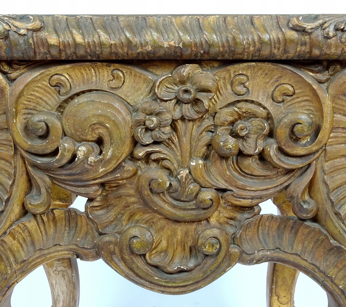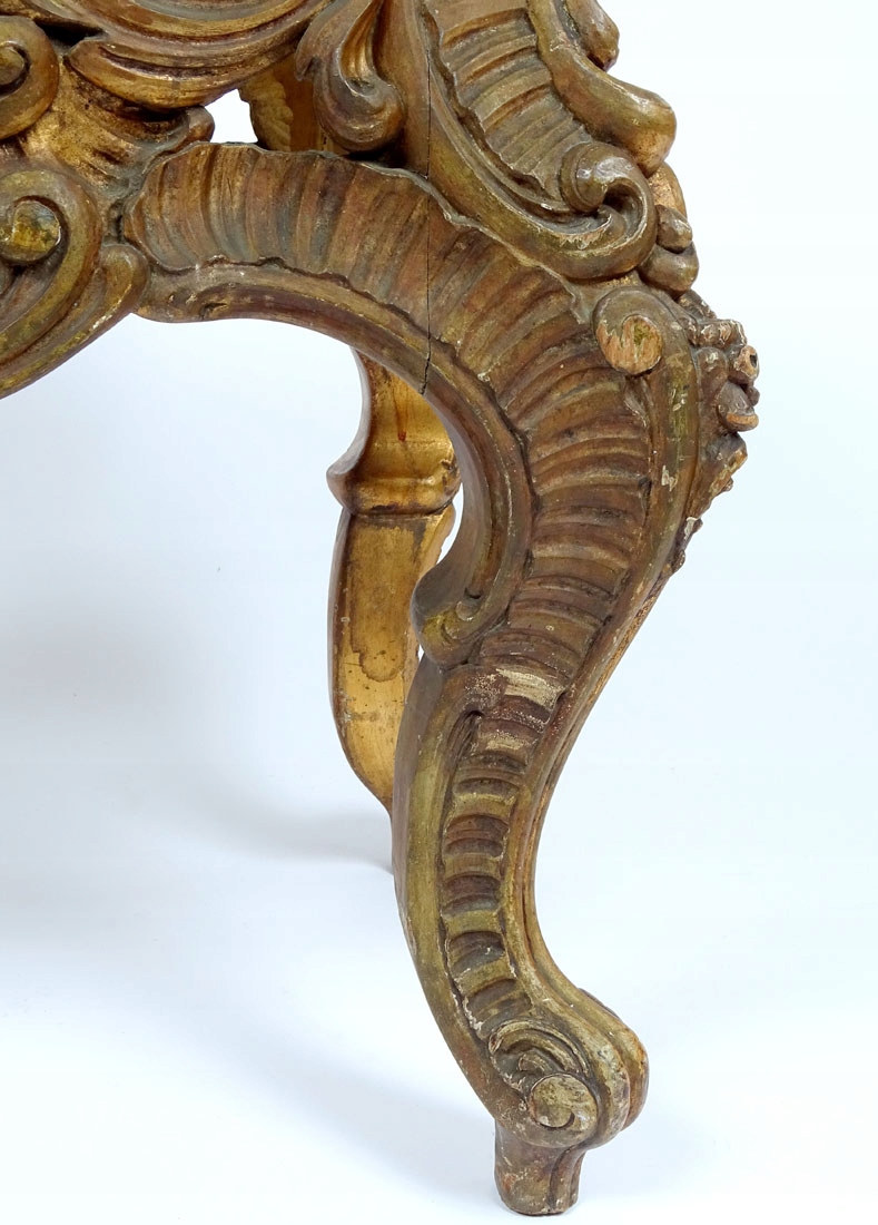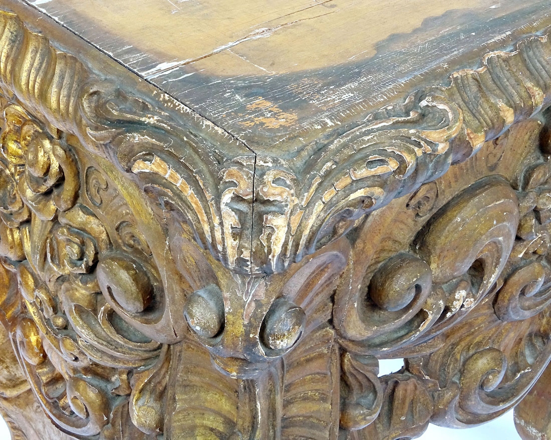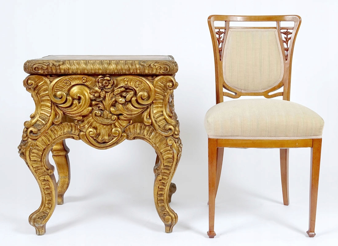 № 88 - Бароковий п'єдестал, що спирається на чотири сильно вигнуті ніжки кабріола, що закінчуються витонченою ніжкою. Дуже багате різьблення з обох сторін у вигляді черепашок, бутонів квітів, стебел і листків аканта з витонченим ажуром. Кути меблів сильно заглиблені. Верх прямокутної форми, плаский, прикрашений різьбленням по всьому периметру, з трохи розширеними кутами, прикрашений листям. Зверху є дві невеликі тріщини, які не впливають на структуру та стійкість постаменту. З одного боку, позолота збереглася гірше.
