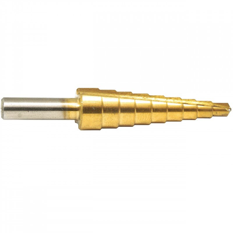 Високоякісне конічне свердло з титановим покриттям, виготовлене за технологією HSS. Свердла з градуюванням через кожні 1 мм з циліндричними ручками та чіткою нумерацією. Свердло для металу, тонкостінних сталевих листів, пластмас. Незамінний для центрування, свердління нових і розсвердлювання старих отворів. Для використання в роботі з листовим металом, слюсарній та столярній справі.