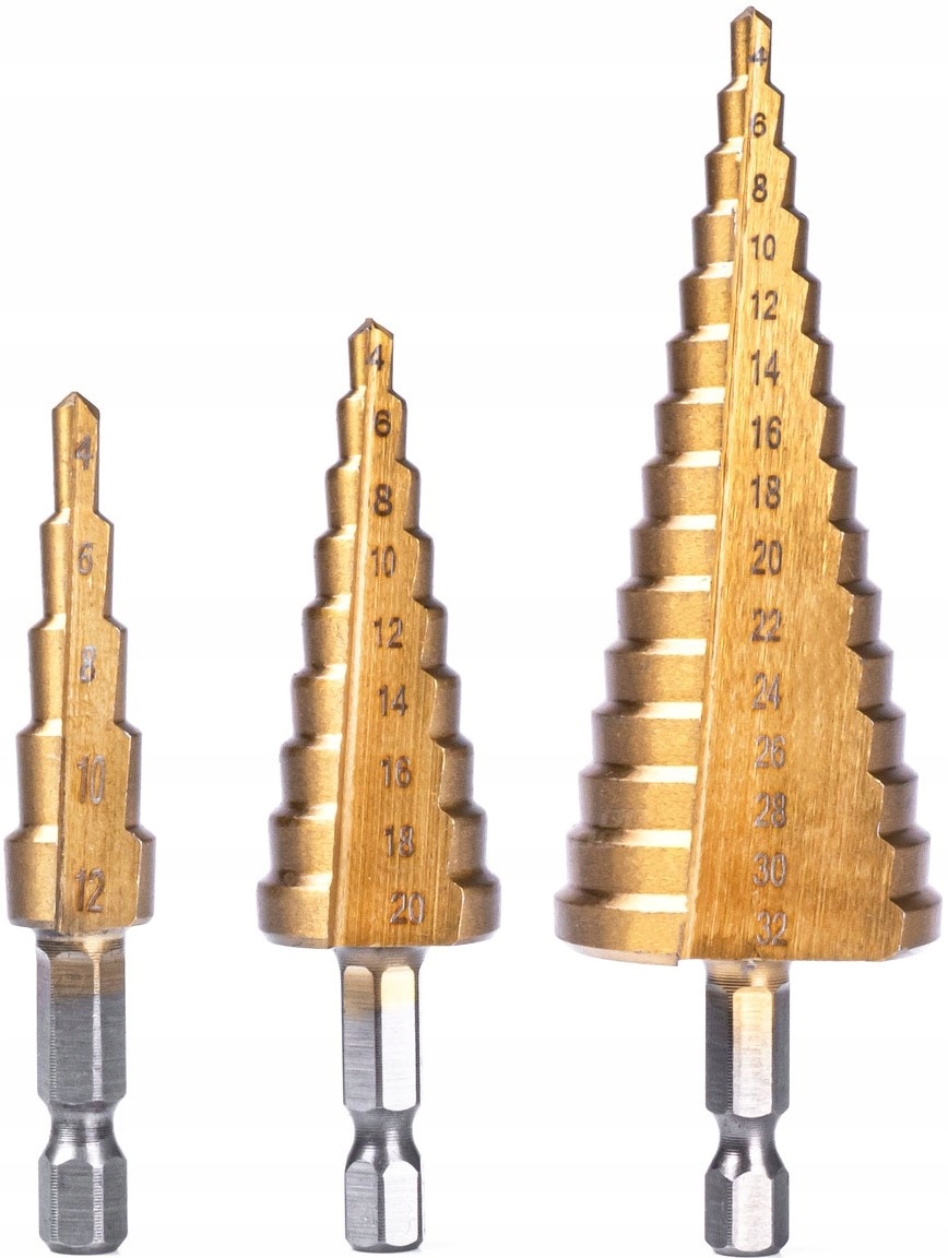 - шліфовані конічні дрилі були виготовлені з високої якості високої сталі HSS та покриті титановим покриттям. 4 4 4